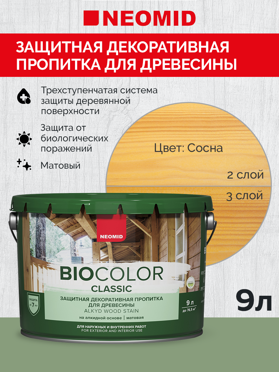 Купить Декоративная Пропитка для Древесины Neomid Biocolor Classic 9л Сосна Полуматовая, Глубокопроникающая / Неомид Био Колор Классик.