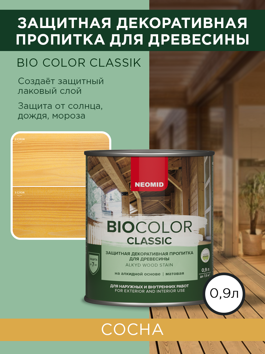 Декоративная Пропитка для Древесины Neomid Biocolor Classic 9л Сосна Полуматовая, Глубокопроникающая / Неомид Био Колор Классик.