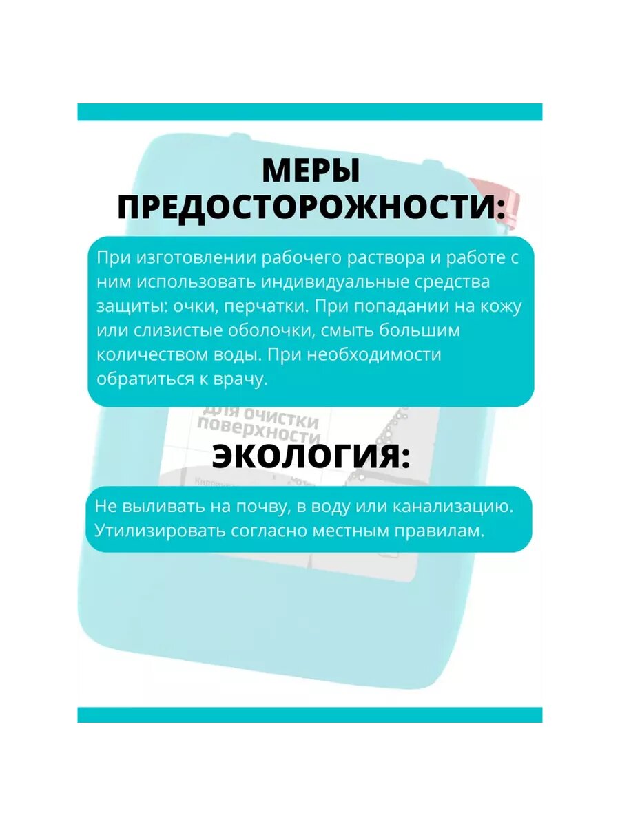 | Дополнительная информация | Расход очистителя: зависит от пористости и водопоглощения обрабатываемой поверхности: крупные остатки раствора: концентрация - 1:1, или 50-100 мл средства на м2 старые высолы, загрязнения: концентрация - 1:3, или 400-500 мл средства на м2 известковый налет, ржавчина: концентрация - 1:5, или 200-300 мл средства на м2 Меры предосторожности: При изготовлении рабочего раствора и работе с ним использовать индивидуальные средства защиты: очки, перчатки. При попадании на кожу или слизистые оболочки, смыть большим количеством воды. При необходимости обратиться к врачу. Экология: Не выливать на почву, в воду или канализацию. Утилизировать согласно местным правилам. Транспортировка: Транспортировать отдельно от пищевых продуктов. Пожаровзрывобезопасен. |