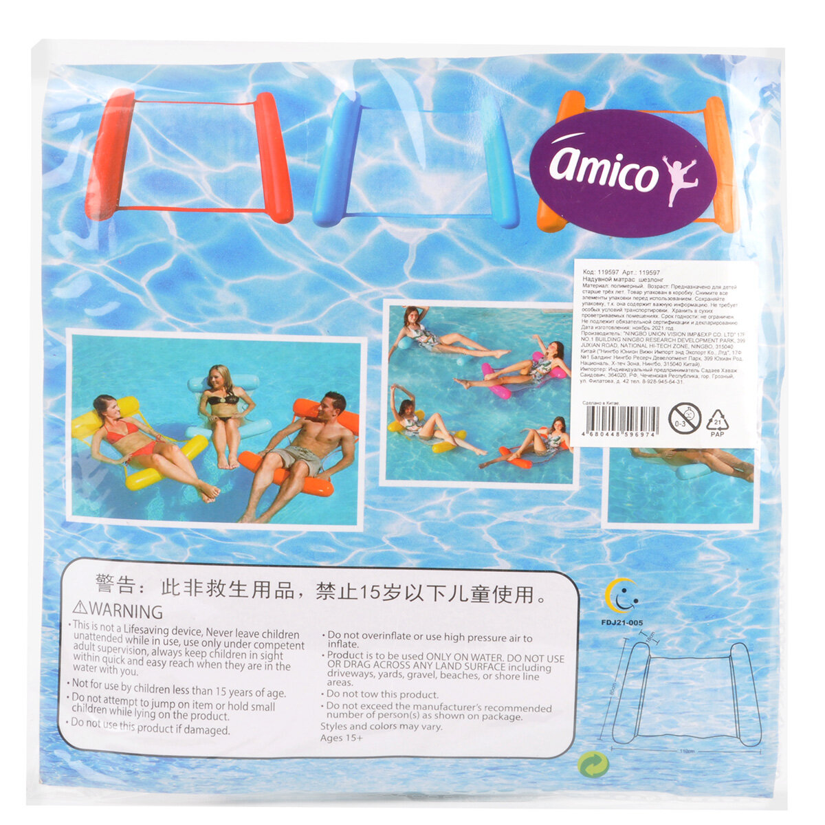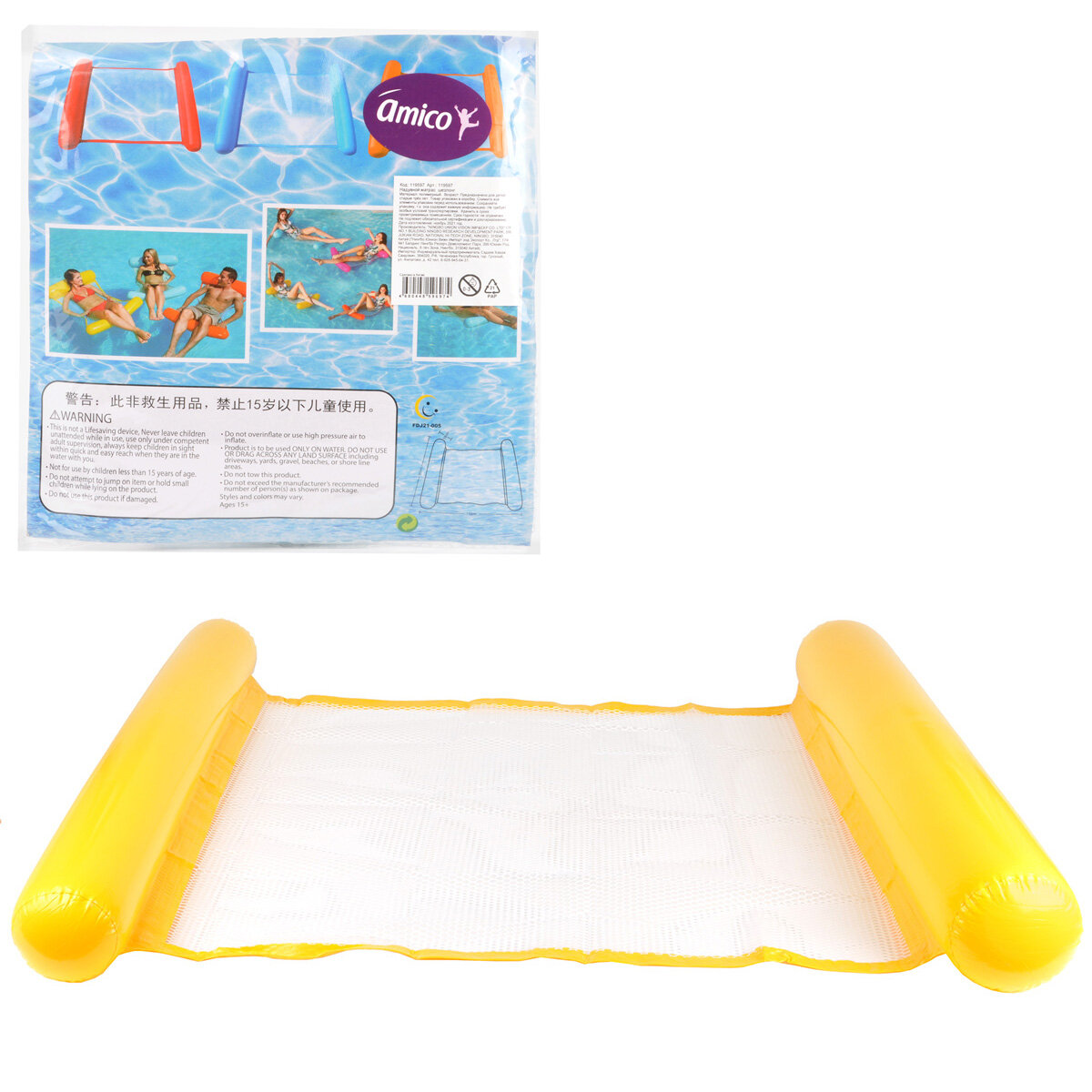 Надувной матрас шезлонг для плавания 110х80 см, Amico / Плавательный водный гамак для бассейна и моря, 125972
