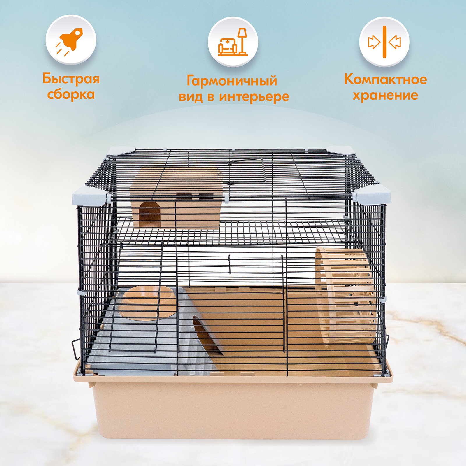 Клетка для грызунов "PetTails" разборная, шаг прута 10,5мм, 42*30*h37см, 1 этаж (+полка-домик, колесо, миска, пласт. домик) бежевая