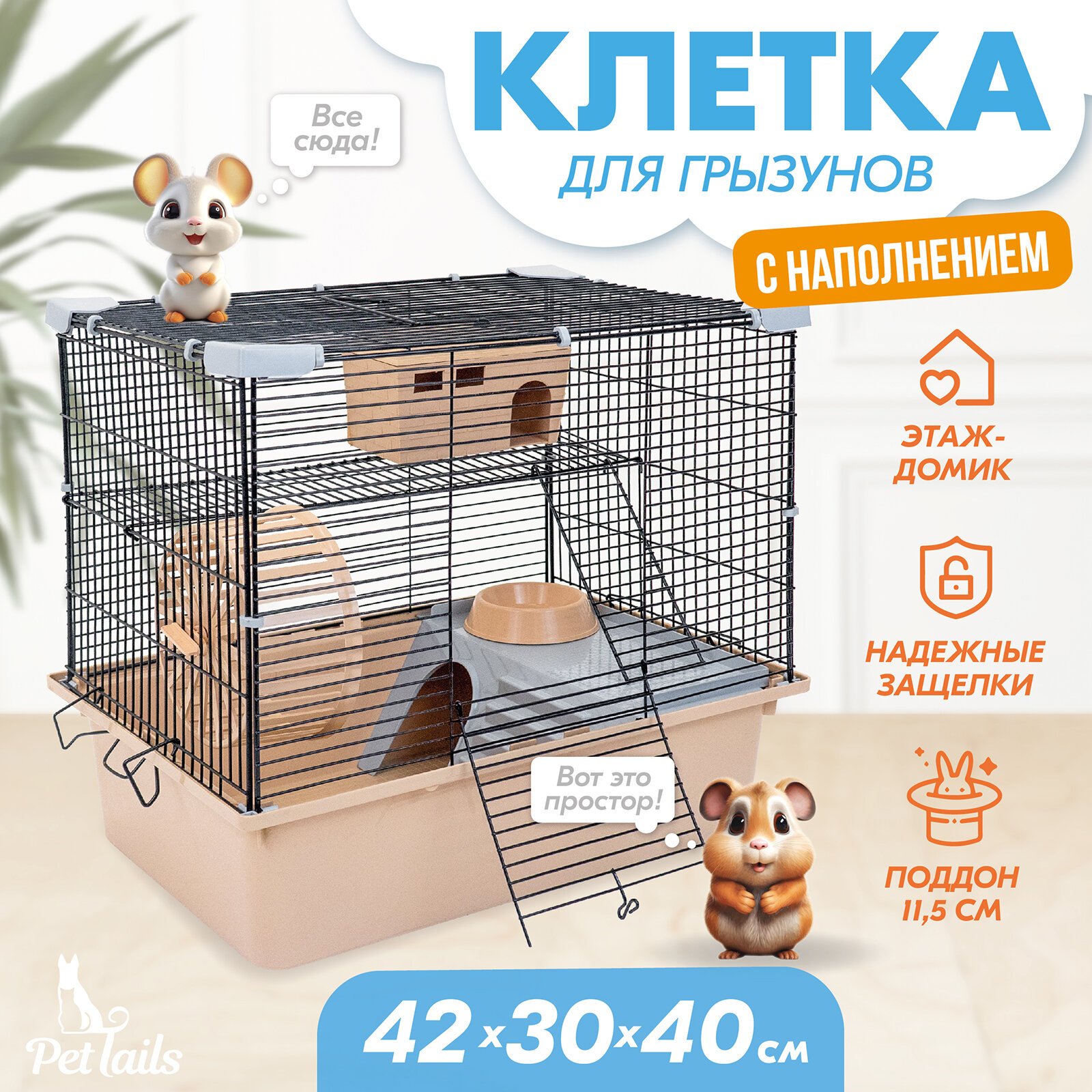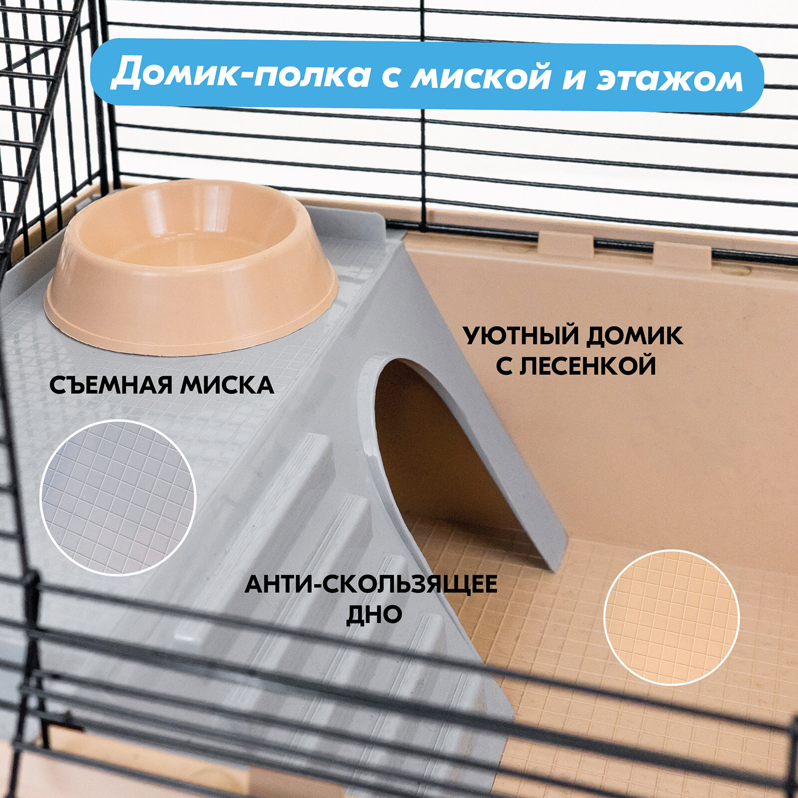 Купить Клетка для грызунов "PetTails" разборная, шаг прута 10,5мм, 42*30*h40см, 1 этаж (+полка-домик, колесо, миска, пласт. домик) бежевая