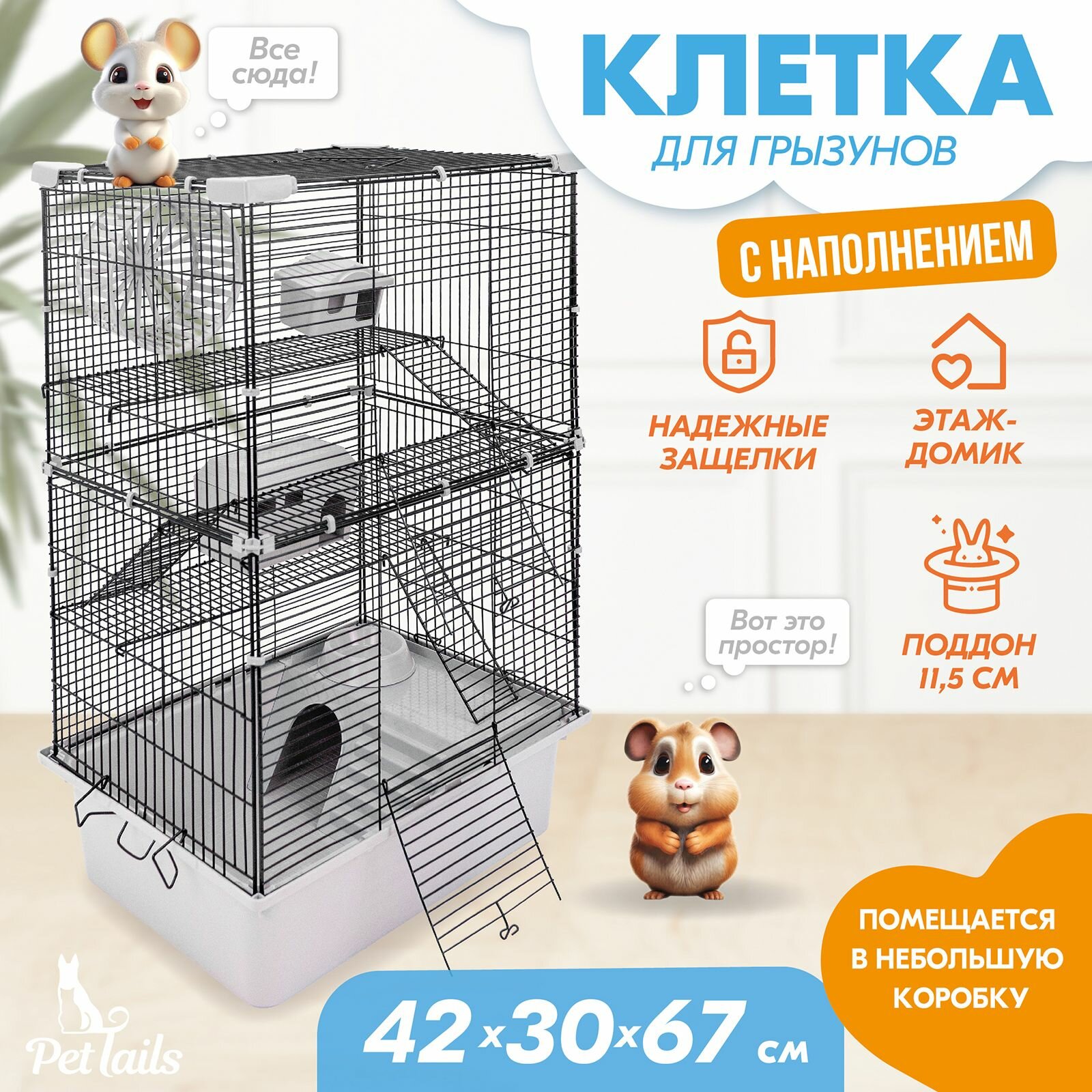 Купить Клетка для грызунов "PetTails" разборная, шаг прута 10,5мм, 42*30*h67см, 3 этажа (+полка-домик, колесо, миска, 2 пласт. домика) светло-серая