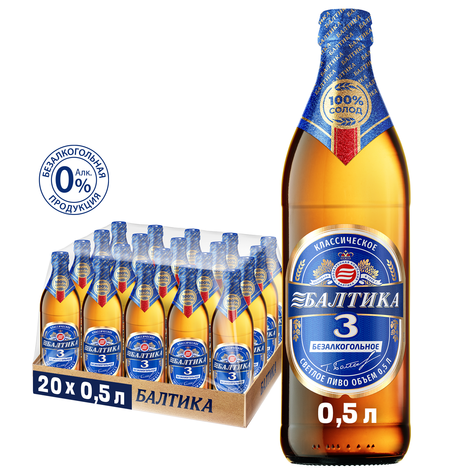 Купить Пиво Балтика №3 Безалкогольное Светлое, 20 шт. х 0,5 л, бутылка