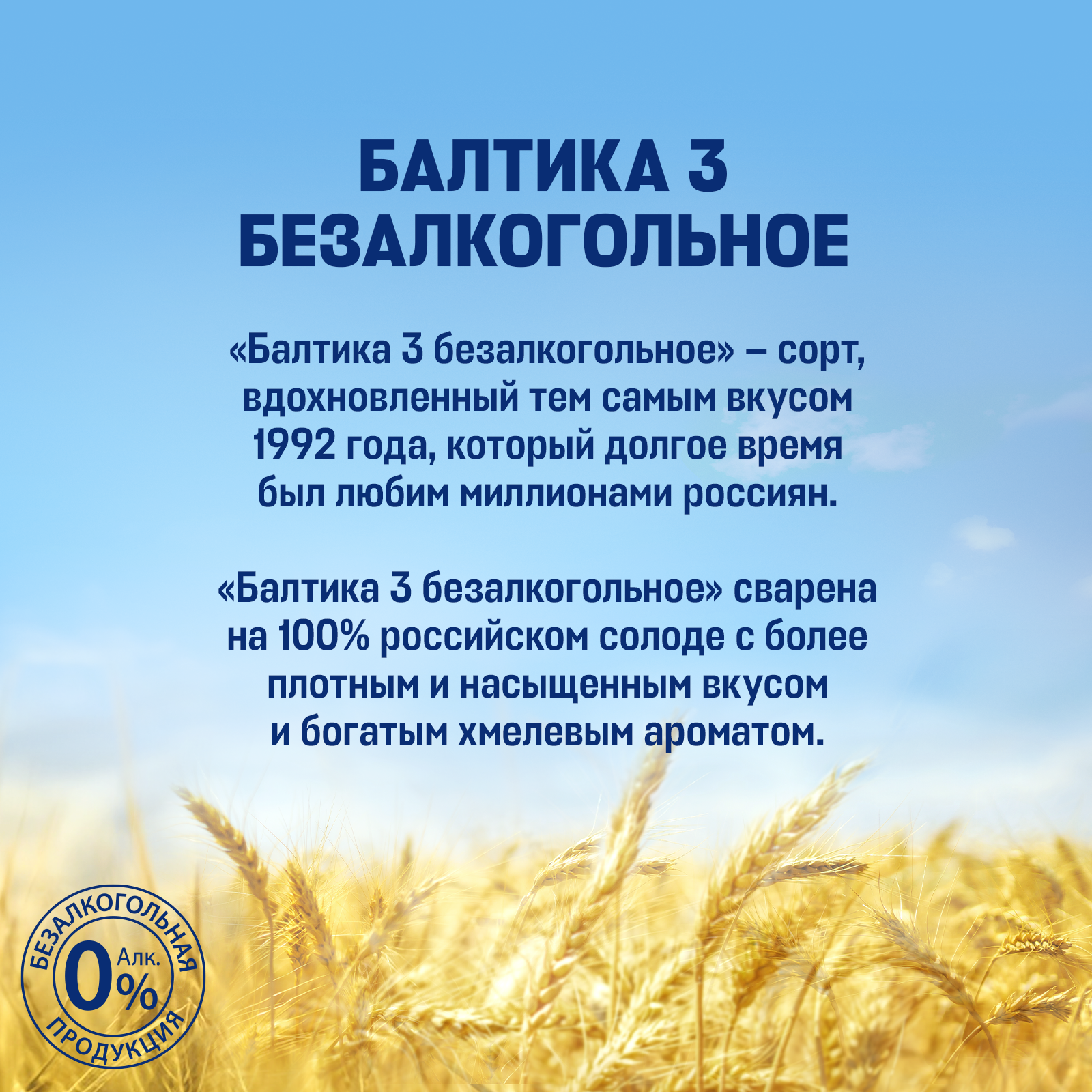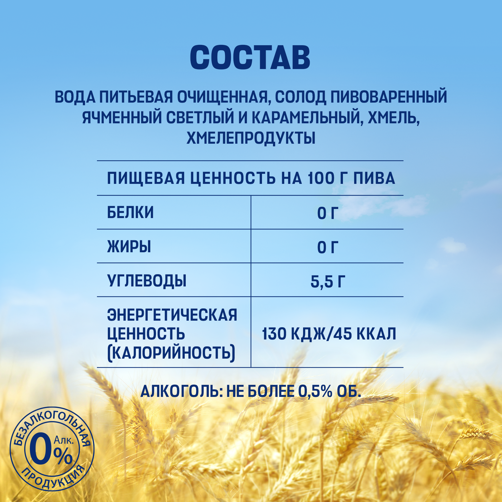 | Дегустационные характеристики | Светлый фильтрованный безалкогольный лагер с плотным насыщенным вкусом, солодовыми и хмелевыми нотами в аромате. |