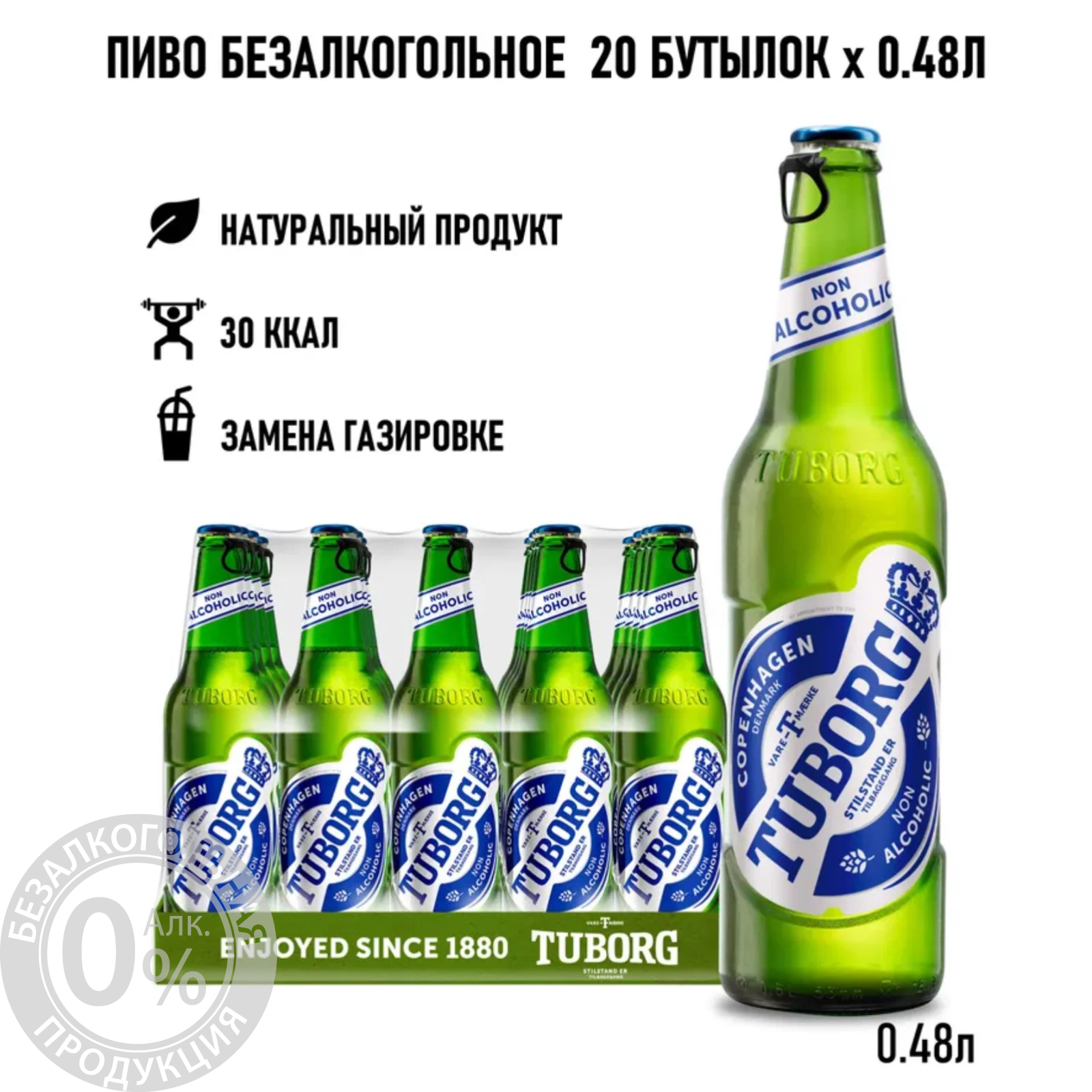 Пиво Tuborg Non-Alcoholic Безалкогольное Светлое, 20 шт. х 0,48 л, бутылка интересное:
