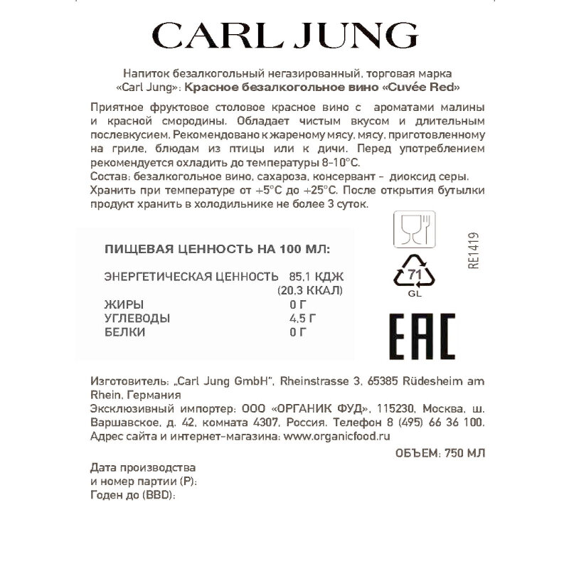 Вино безалкогольное Carl Jung (Карл Юнг) Cuvee Red ( Кюве Ред) красное полусухое, 750 мл интересное: