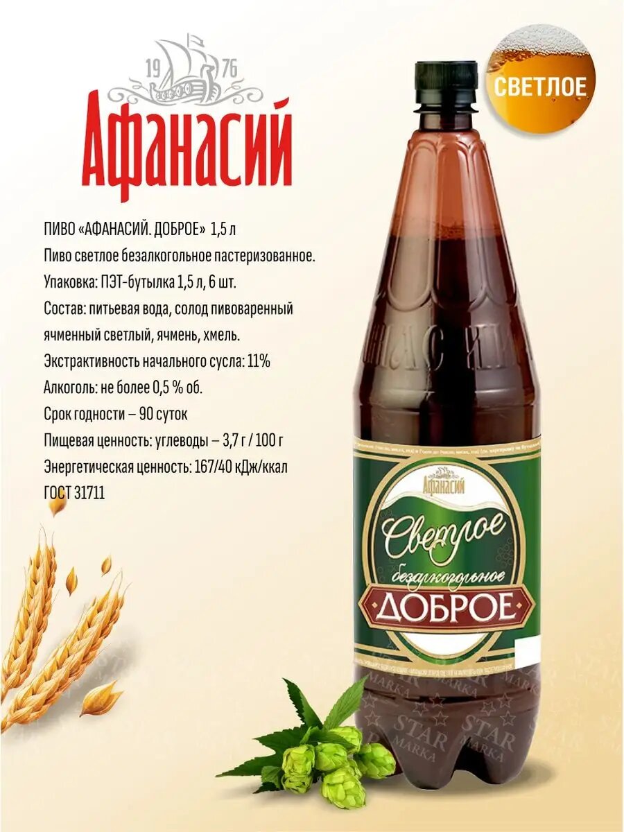 Пиво безалкогольное Афанасий Доброе светлое 1,5л, 6 бутылок интересное: