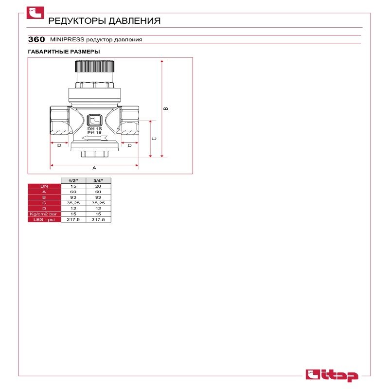 Редуктор давления ITAP 360 1/2" стандартный проход без подключения манометра