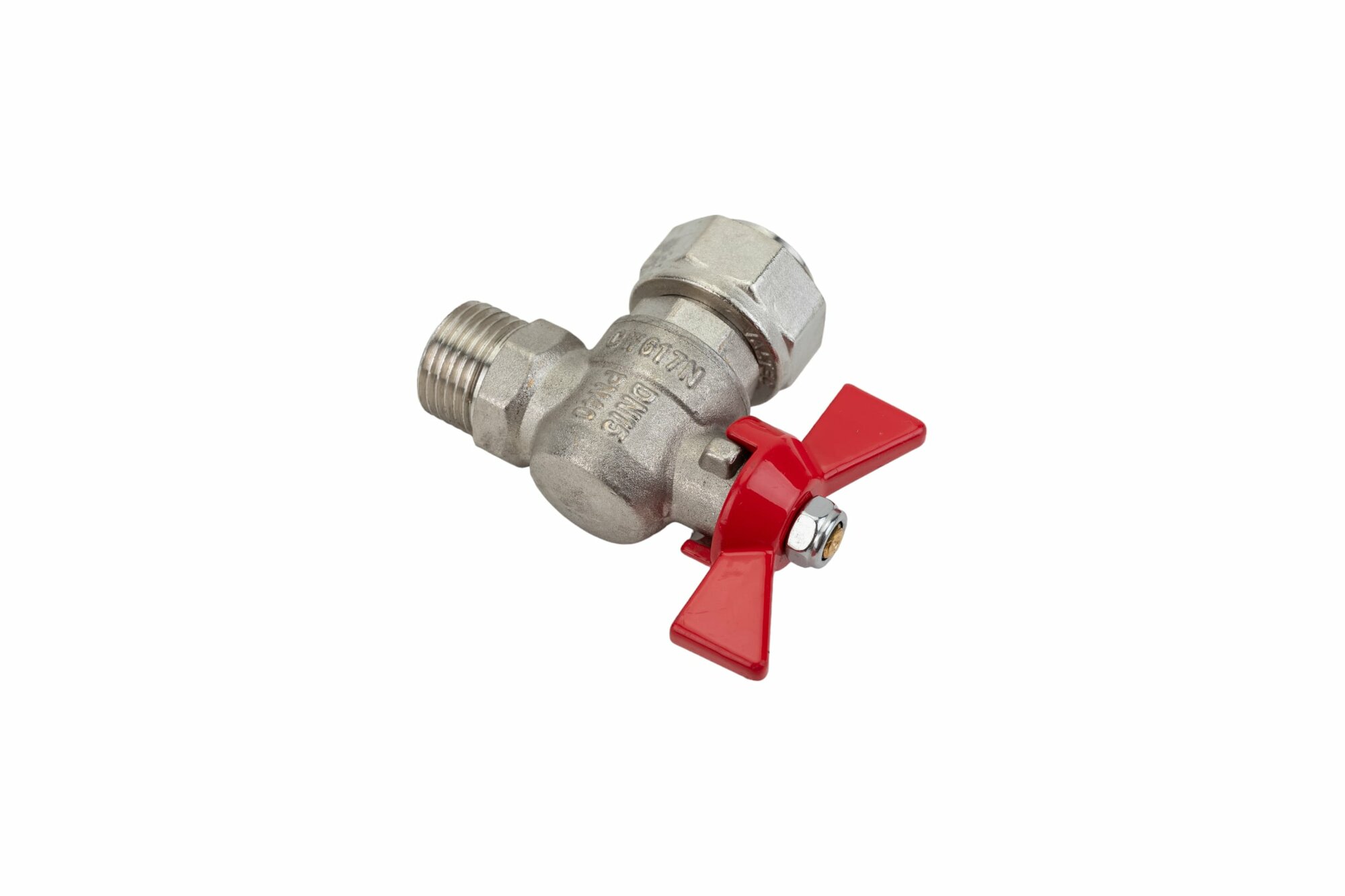 Кран шаровой латунный Valtec Base 1/2 НР(ш) х 3/4 ВР(г) T-образный бабочка с накидной гайкой угловой (VT.267.N.0405)