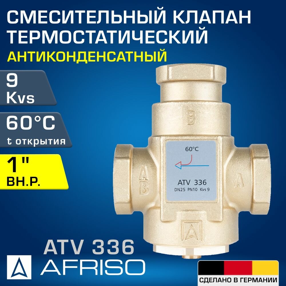 AFRISO ATV 336 (1633610) 60 C, DN25, Kvs 9, 1" вн.р. - Антиконденсатный термостатический смесительный клапан трехходовой ДУ 25, открытие 60 градусов интересное: