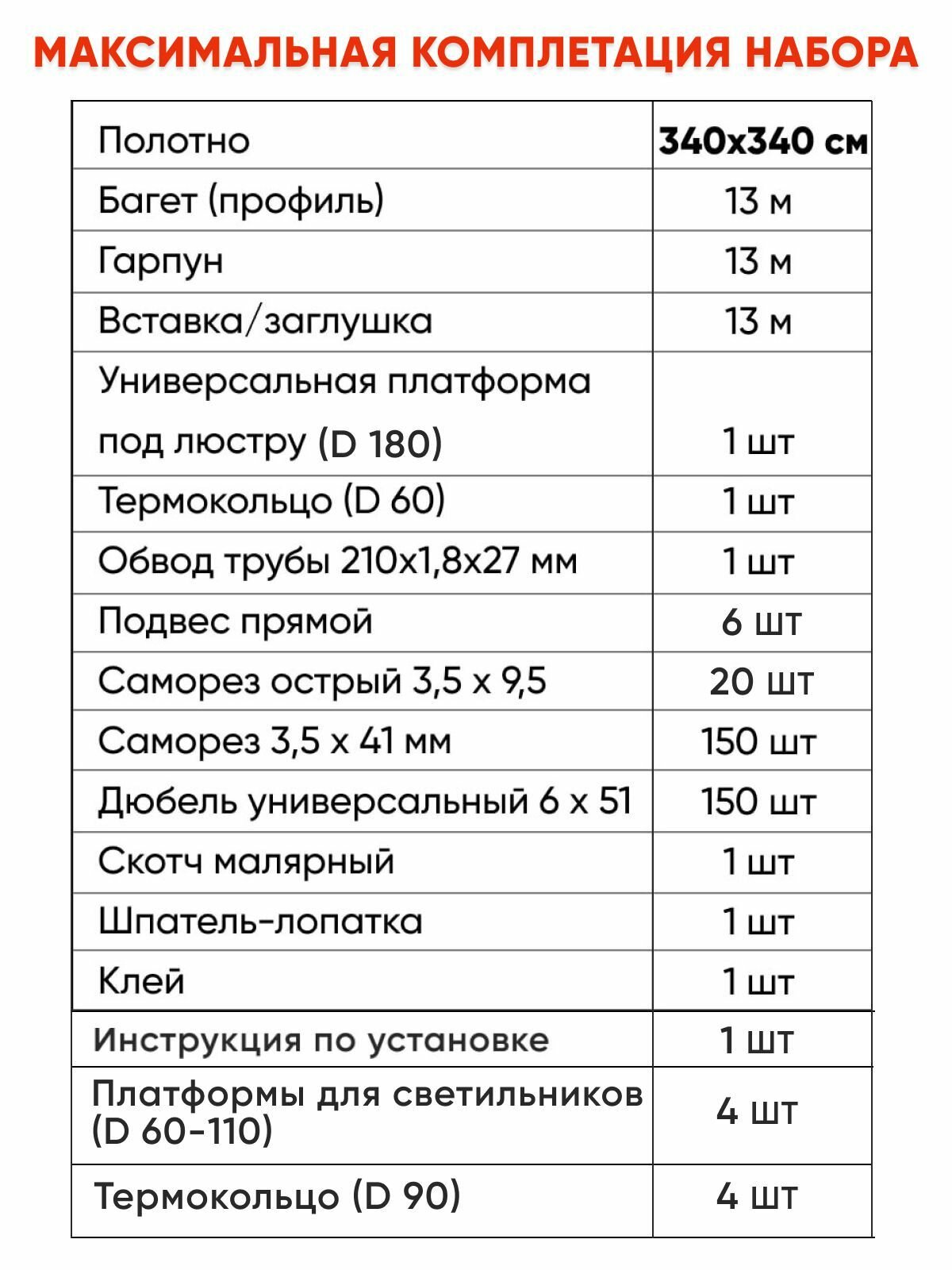 | Подробная комплектация | Полотно- 500x660 см. Багет (профиль) - 23 м. Гарпун - 23 м. Вставка/заглушка - 23 м. Универсальная платформа под люстру (D 180-250) – 1 шт. Термокольцо (D 60) – 1 шт. Обвод трубы 210x1,8 x 27 мм.- 1 шт. Подвес прямой – 2 шт. Саморез острый 3,5 x 9,5- 8 шт. Саморез 3,5 x 41 мм – 150 шт. Дюбель универсальный 6 x 51- 150 шт. Скотч малярный – 1 шт. Шпатель-лопатка – 1 шт. Клей – 1шт. |