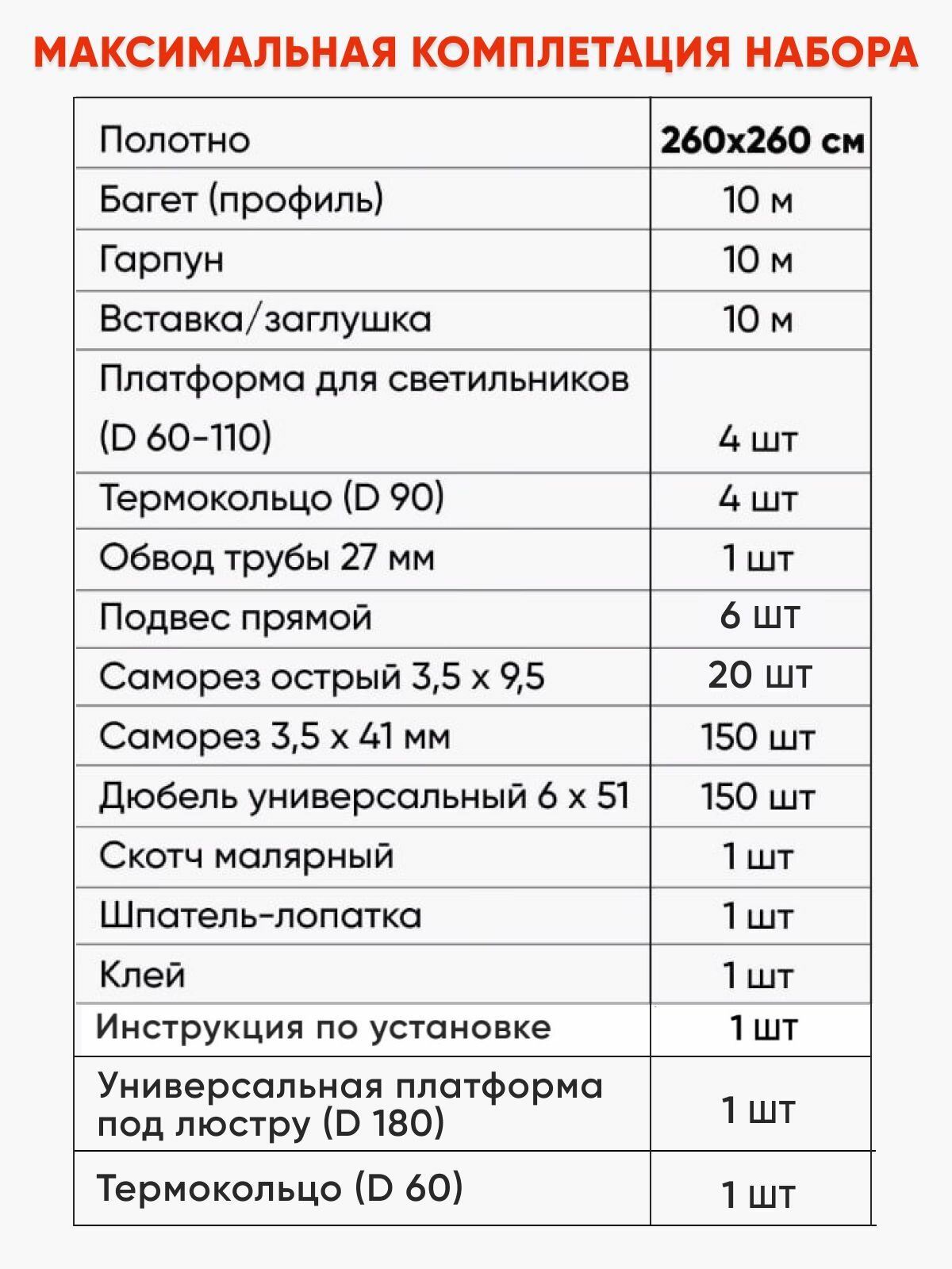 | Подробная комплектация | Полотно- 500x660 см. Багет (профиль) - 23 м. Гарпун - 23 м. Вставка/заглушка - 23 м. Универсальная платформа под люстру (D 180-250) – 1 шт. Термокольцо (D 60) – 1 шт. Обвод трубы 210x1,8 x 27 мм.- 1 шт. Подвес прямой – 2 шт. Саморез острый 3,5 x 9,5- 8 шт. Саморез 3,5 x 41 мм – 150 шт. Дюбель универсальный 6 x 51- 150 шт. Скотч малярный – 1 шт. Шпатель-лопатка – 1 шт. Клей – 1шт. |