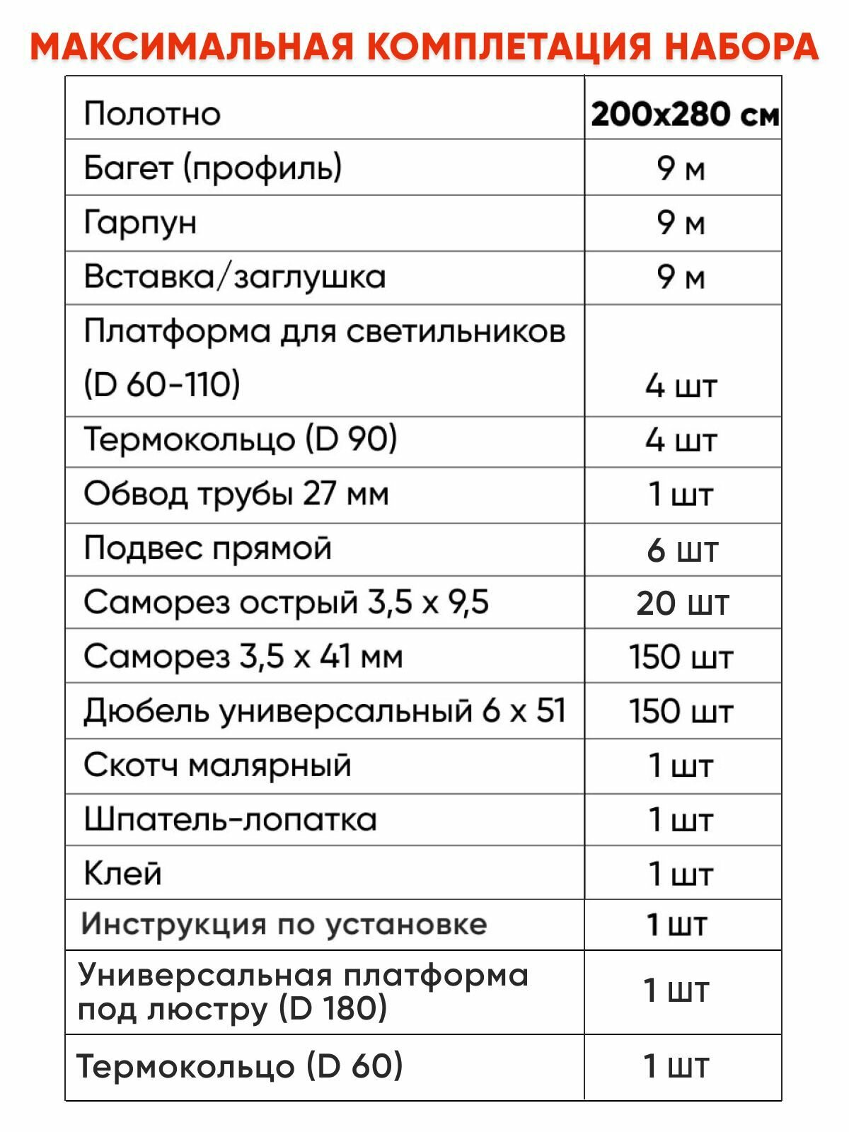 | Подробная комплектация | Полотно- 500x660 см. Багет (профиль) - 23 м. Гарпун - 23 м. Вставка/заглушка - 23 м. Универсальная платформа под люстру (D 180-250) – 1 шт. Термокольцо (D 60) – 1 шт. Обвод трубы 210x1,8 x 27 мм.- 1 шт. Подвес прямой – 2 шт. Саморез острый 3,5 x 9,5- 8 шт. Саморез 3,5 x 41 мм – 150 шт. Дюбель универсальный 6 x 51- 150 шт. Скотч малярный – 1 шт. Шпатель-лопатка – 1 шт. Клей – 1шт. |