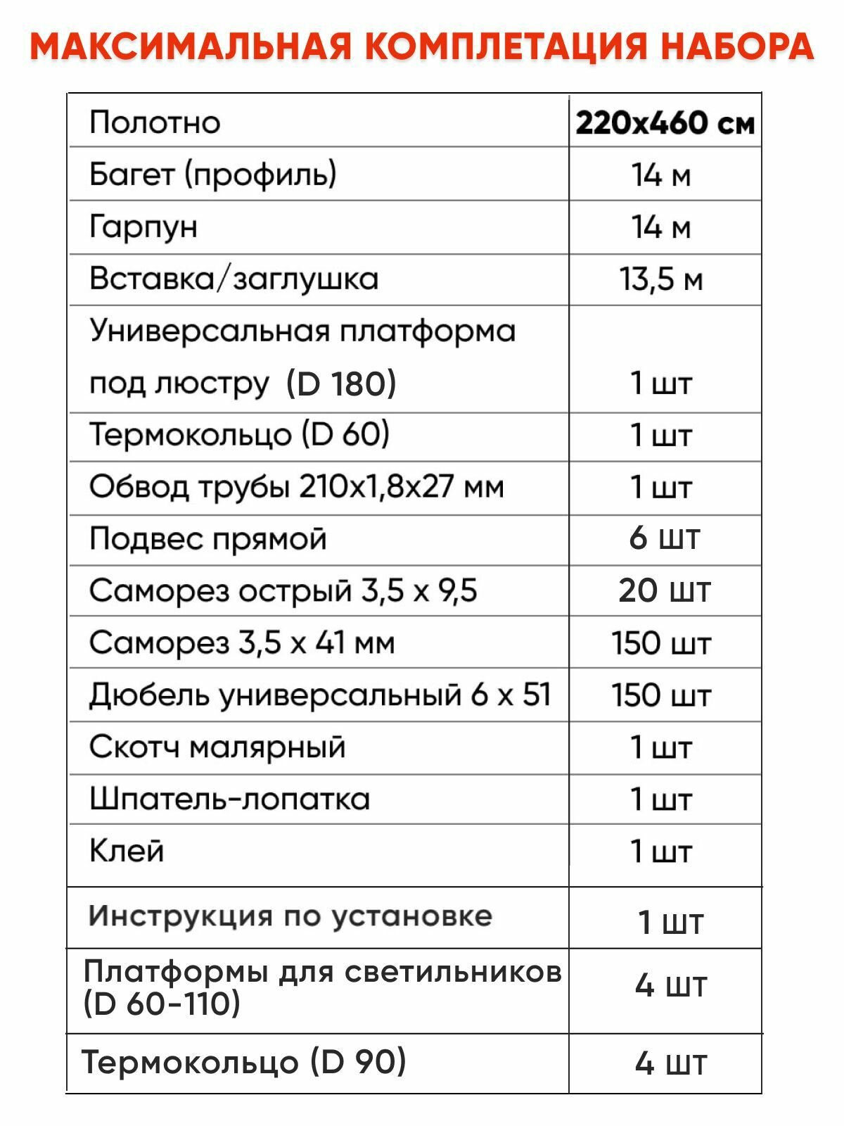 | Подробная комплектация | Полотно- 500x660 см. Багет (профиль) - 23 м. Гарпун - 23 м. Вставка/заглушка - 23 м. Универсальная платформа под люстру (D 180-250) – 1 шт. Термокольцо (D 60) – 1 шт. Обвод трубы 210x1,8 x 27 мм.- 1 шт. Подвес прямой – 2 шт. Саморез острый 3,5 x 9,5- 8 шт. Саморез 3,5 x 41 мм – 150 шт. Дюбель универсальный 6 x 51- 150 шт. Скотч малярный – 1 шт. Шпатель-лопатка – 1 шт. Клей – 1шт. |