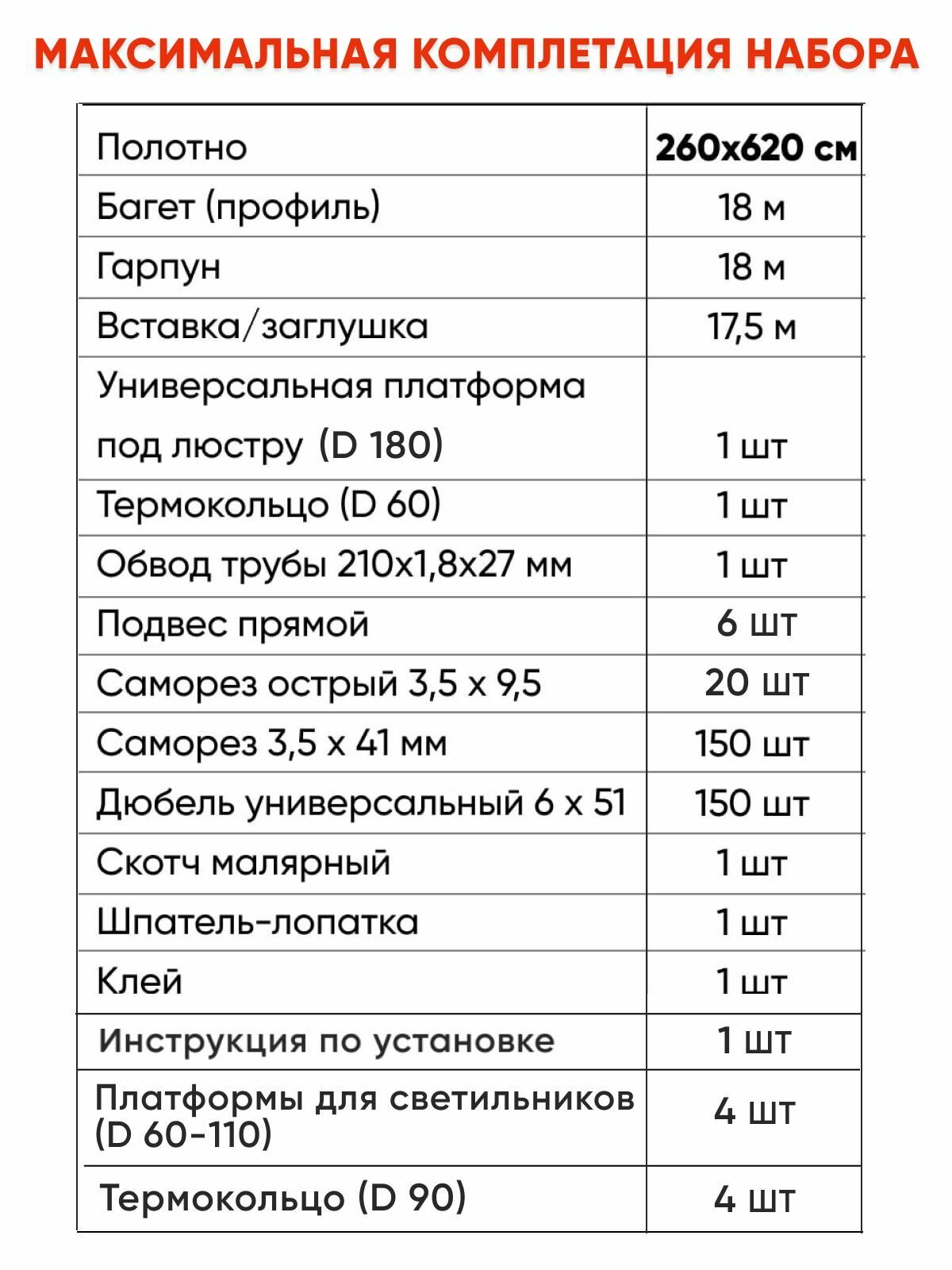 | Подробная комплектация | Полотно- 500x660 см. Багет (профиль) - 23 м. Гарпун - 23 м. Вставка/заглушка - 23 м. Универсальная платформа под люстру (D 180-250) – 1 шт. Термокольцо (D 60) – 1 шт. Обвод трубы 210x1,8 x 27 мм.- 1 шт. Подвес прямой – 2 шт. Саморез острый 3,5 x 9,5- 8 шт. Саморез 3,5 x 41 мм – 150 шт. Дюбель универсальный 6 x 51- 150 шт. Скотч малярный – 1 шт. Шпатель-лопатка – 1 шт. Клей – 1шт. |