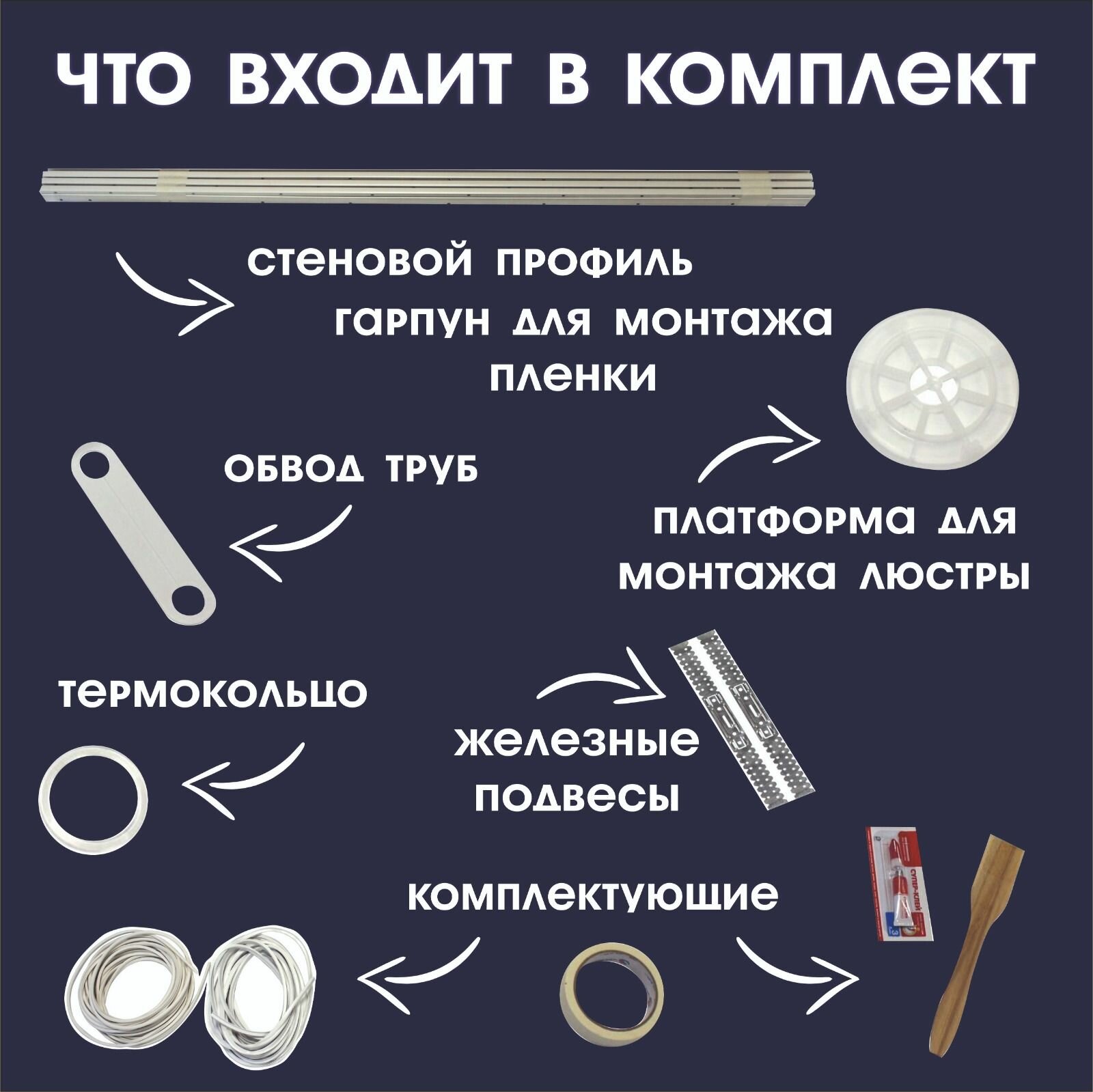 | Подробная комплектация | Полотно MSD-Classic, профиль для установки стеновой, гарпун для монтажа потолка, вставка-заглушка, платформа для монтажа люстры, подвес для крепления люстры, кольцо защитное для монтажа люстры, пластиковый обвод трубы, суперклей, лопатка для монтажа потолка. |