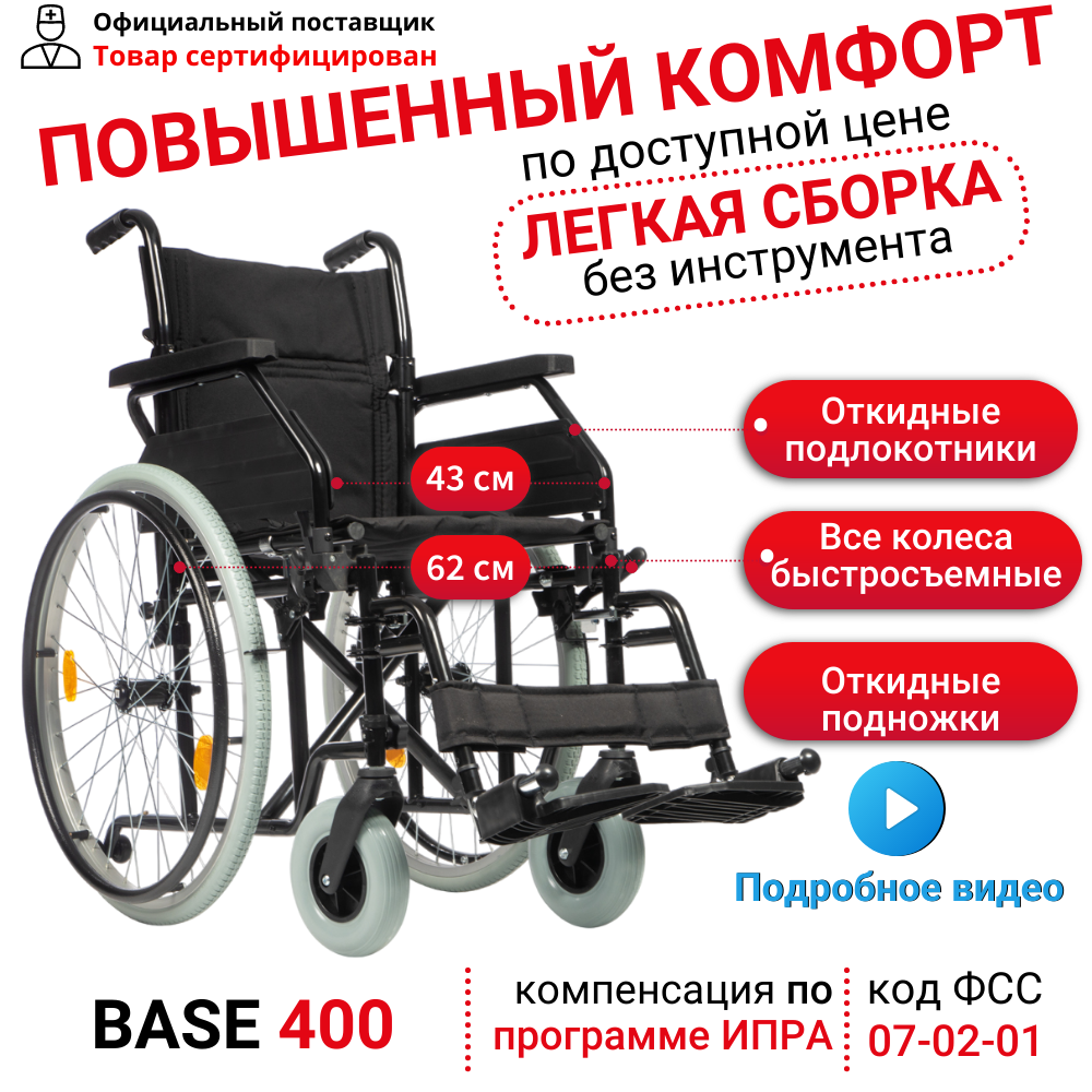 Кресло-коляска инвалидная комнатная Ortonica Base 140/Base 400 ширина сиденья 43 см цельнолитые колеса складная спинка