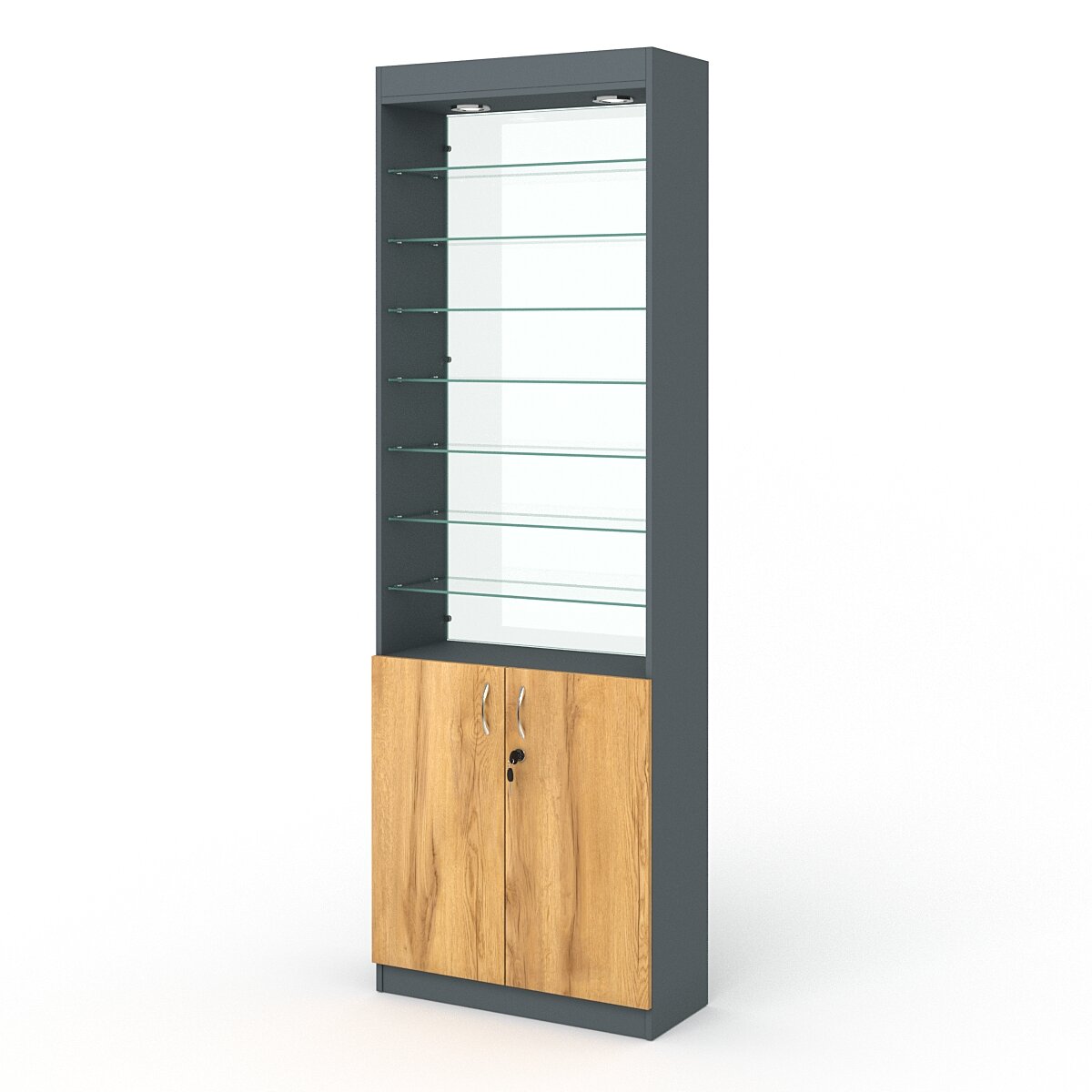 Витрина №6-2 (без дверок, задняя стенка - стекло), Темно-серый и Дуб Золотистый 70 x 30 x 210 см интересное: