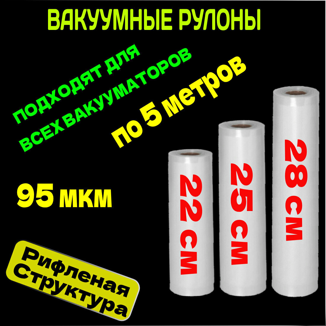 Пакеты для вакууматора набор рулонов 12,15,20,25,28 х 500 см 5 шт 95 мкм / для вакуумного упаковщика / рифленые /для заморозки