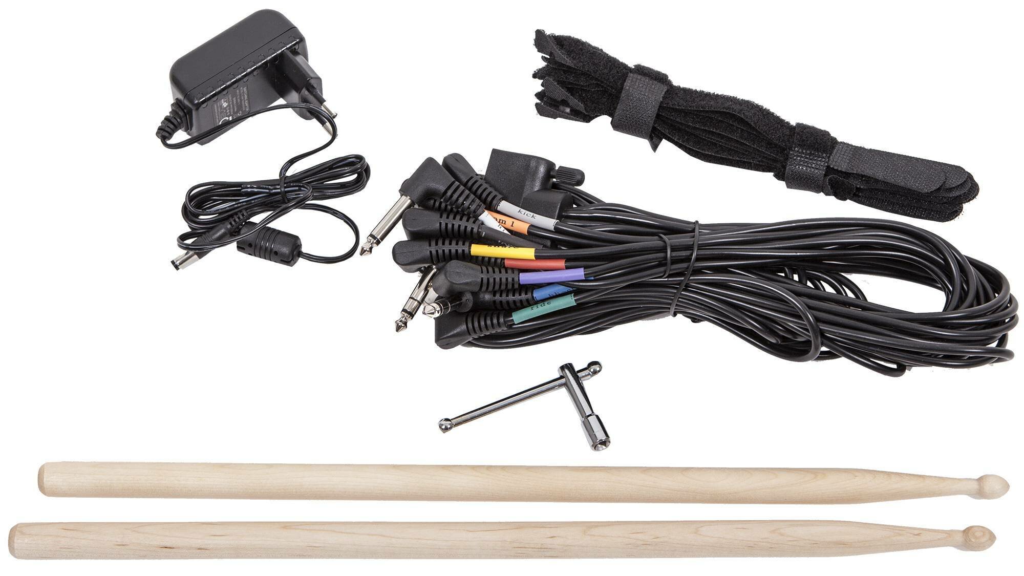 | Подробная комплектация | 5 пэдов барабанов и 3 тарелок. 1 х Малый барабан 10”: 2 зоны; удар в обод и пластик одновременно. 3 х Том-барабан 8”: 2 зоны. 1 х Бас-барабан 8”. 1 х Хай-хэт 10”: 1 зона. 1 х Райд 12”: 1 зона + глушение. 1 х Крэш 12”: 1 зона + глушение. 1 х Педаль хай-хэта. |