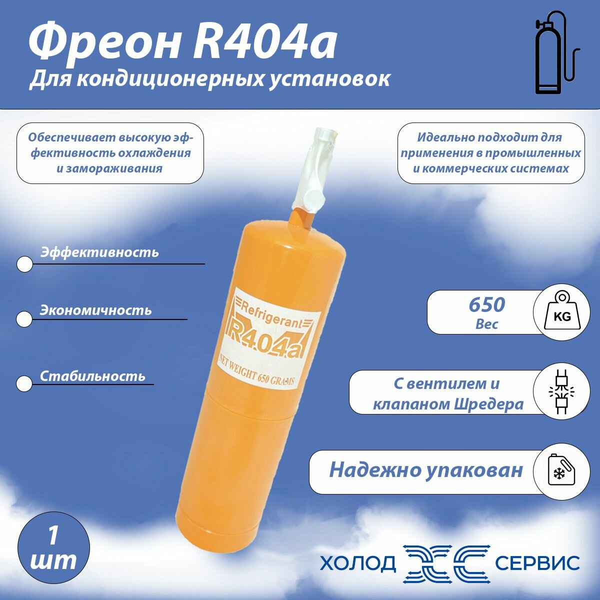 Купить Фреон R-404a, маленький баллон 650 гр. с Вентилем и клапаном Шредера. Хладагент R-404a