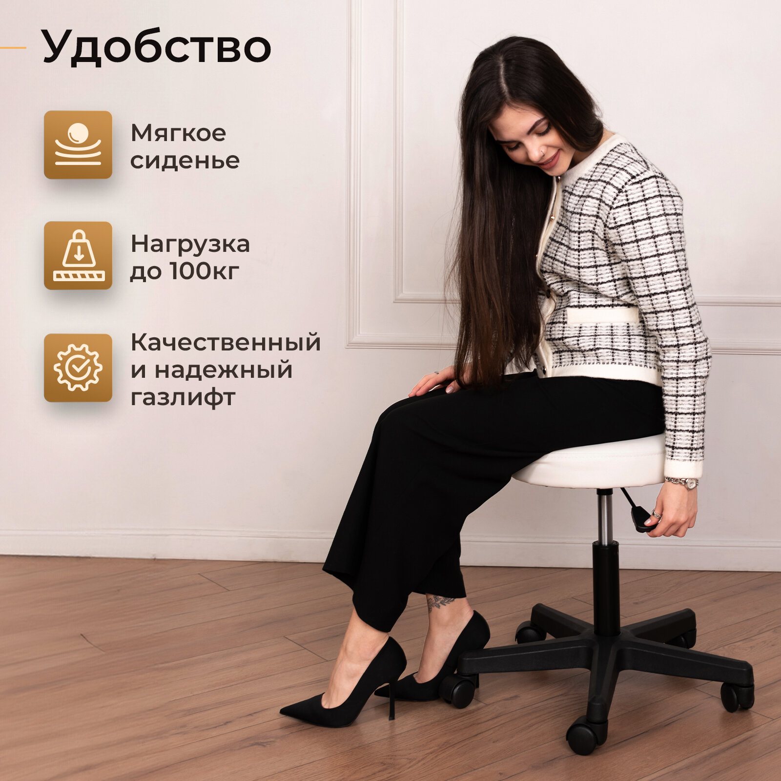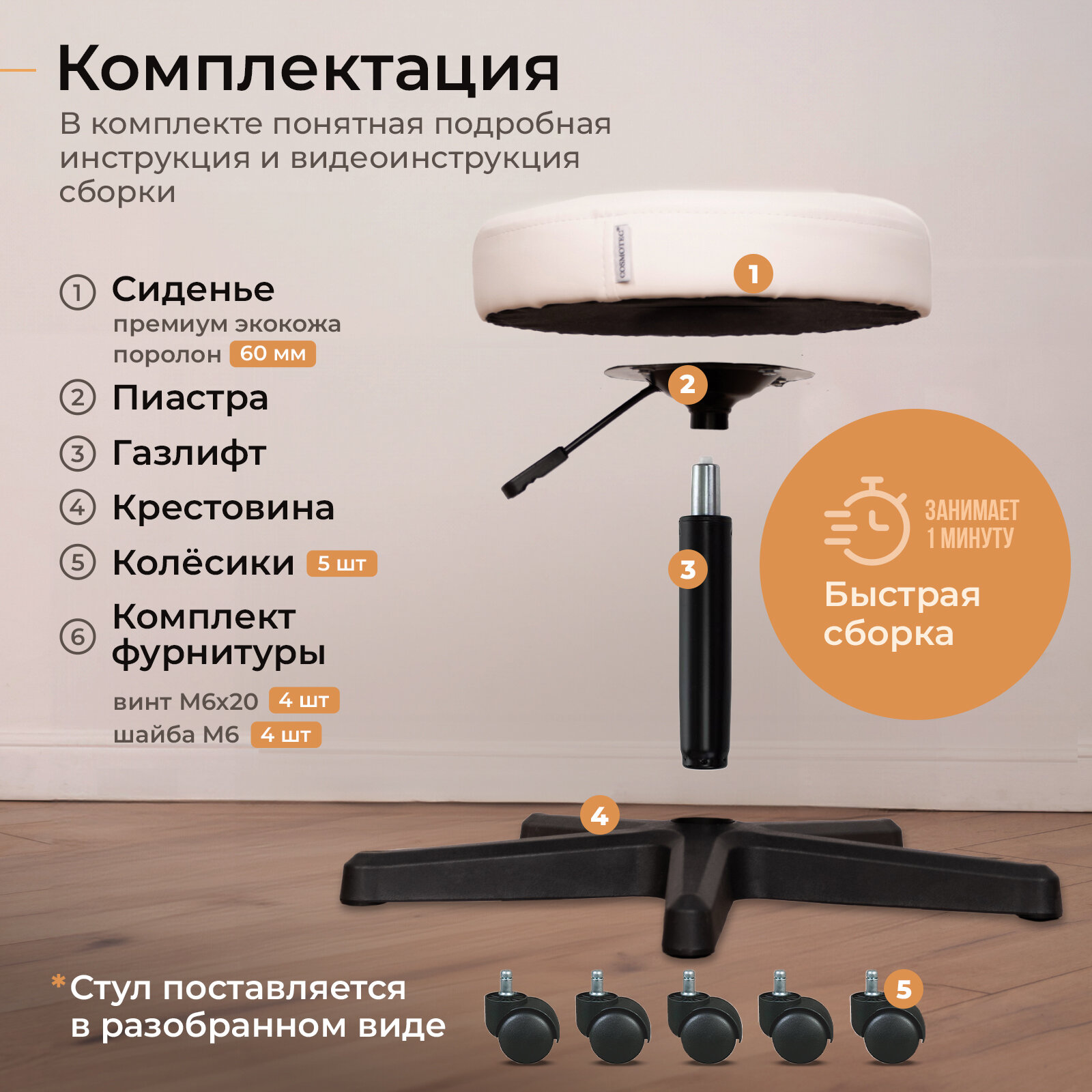 | Подробная комплектация | Пиастра - 1шт; Газлифт - 1шт; Сиденье - 1шт; Пятилучье - 1 шт; Упаковка колес (5шт) - 1шт |