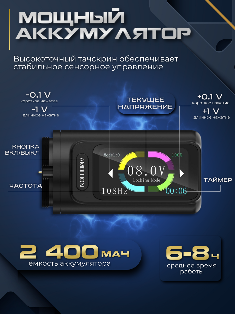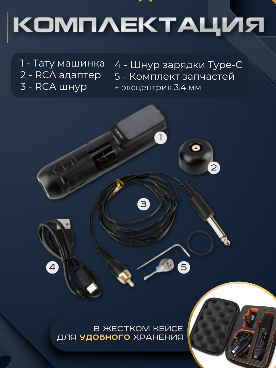 | Комплектация | - Беспроводная машинка Ambition Zetton. - Переходник RCA. - Оригинальный RCA - провод. - Оригинальный кабель для зарядки USB - Type C. - Комплект запчастей: ключ-шестигранник (1шт.), пара винтиков, уплотнительное кольцо (1шт.), эксцентрик на 3,4мм. - Кейс для удобной транспортировки и хранения. |