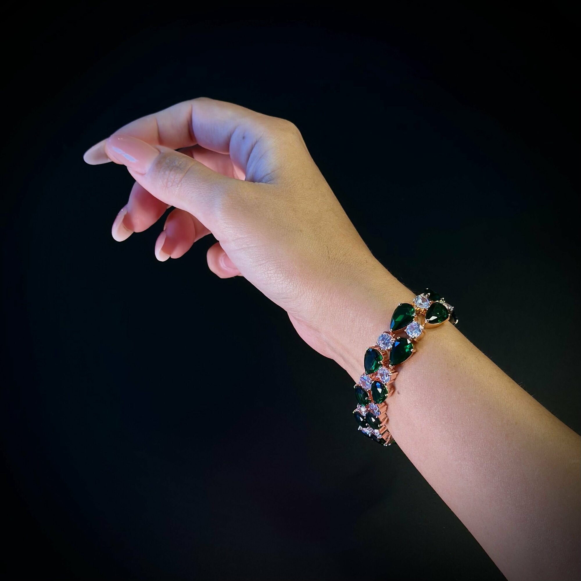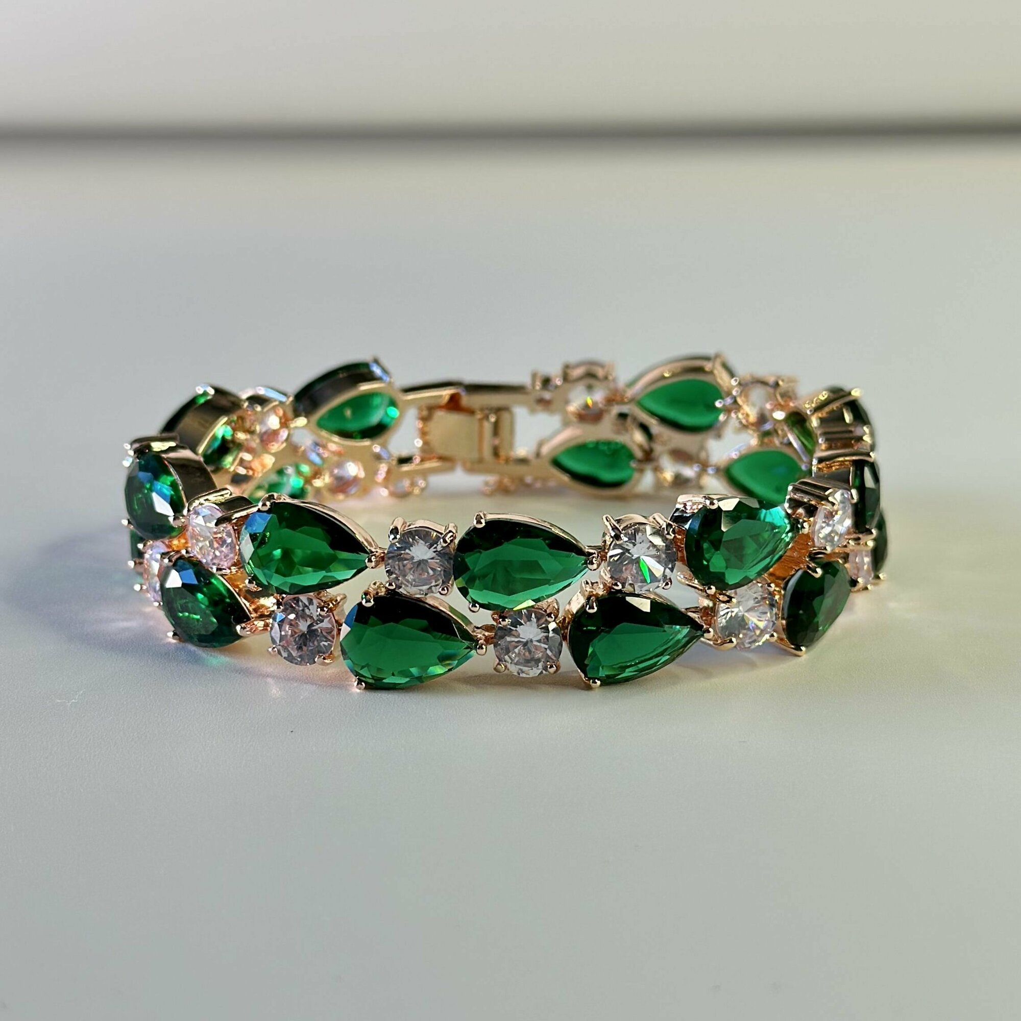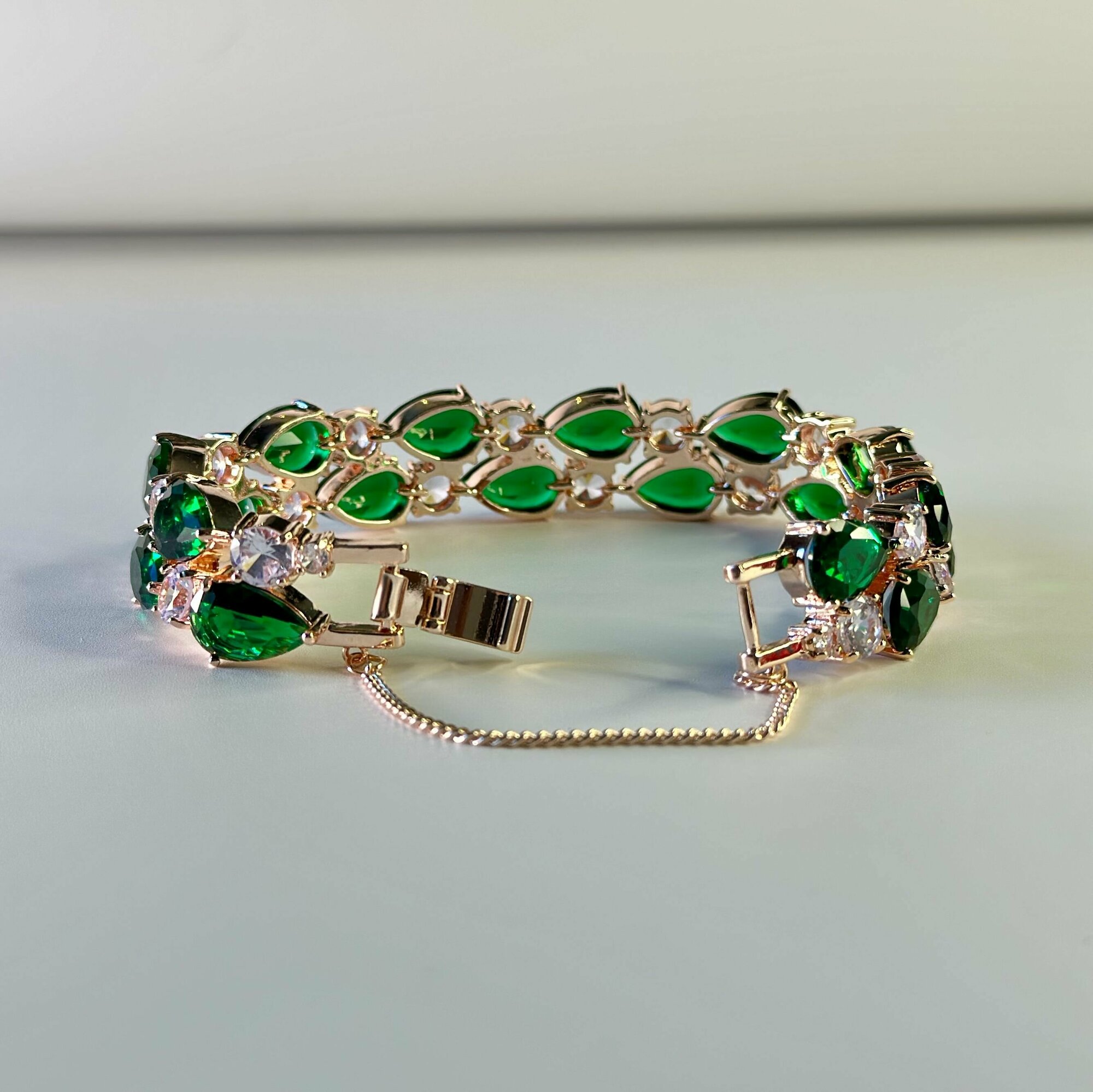 Купить Женский позолоченный браслет "Восторг" с зелёными и прозрачными кристаллами.