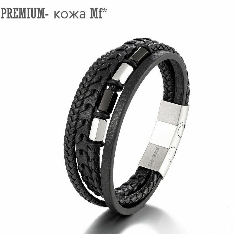 Браслет мужской многослойный из кожи микрофибра и стали 316L с удлинителем/чёрный(19+1.5 см)