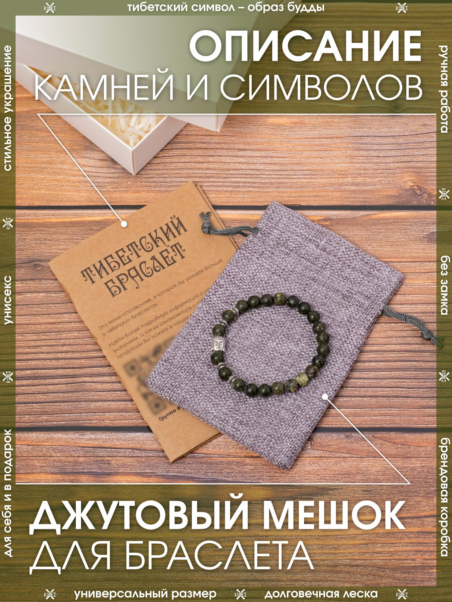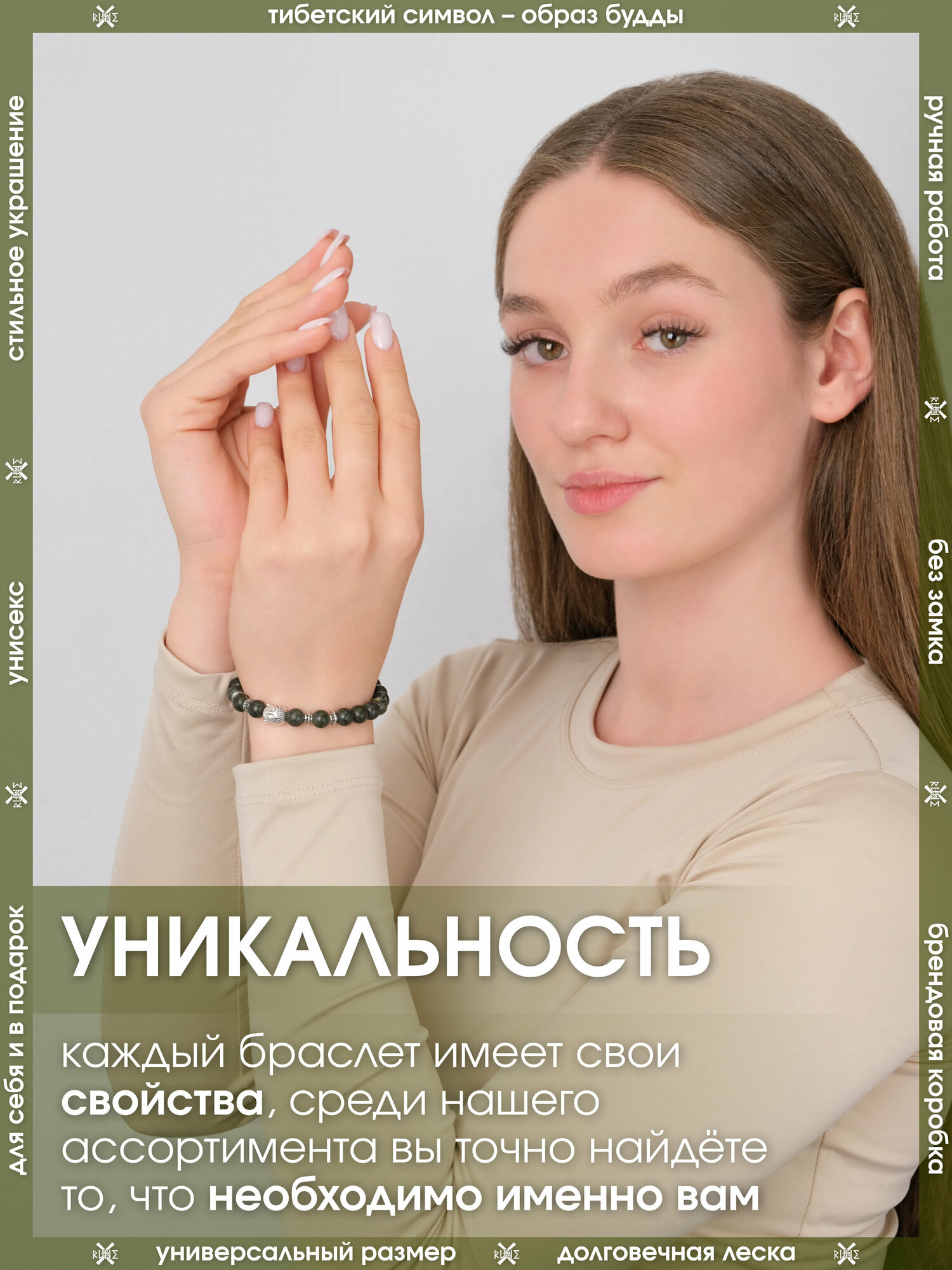 Защитный тибетский браслет Будда из натурального камня Унакит/Охранный оберег-талисман из бусин на руку хаки/Бижутерия для мужчин и женщин