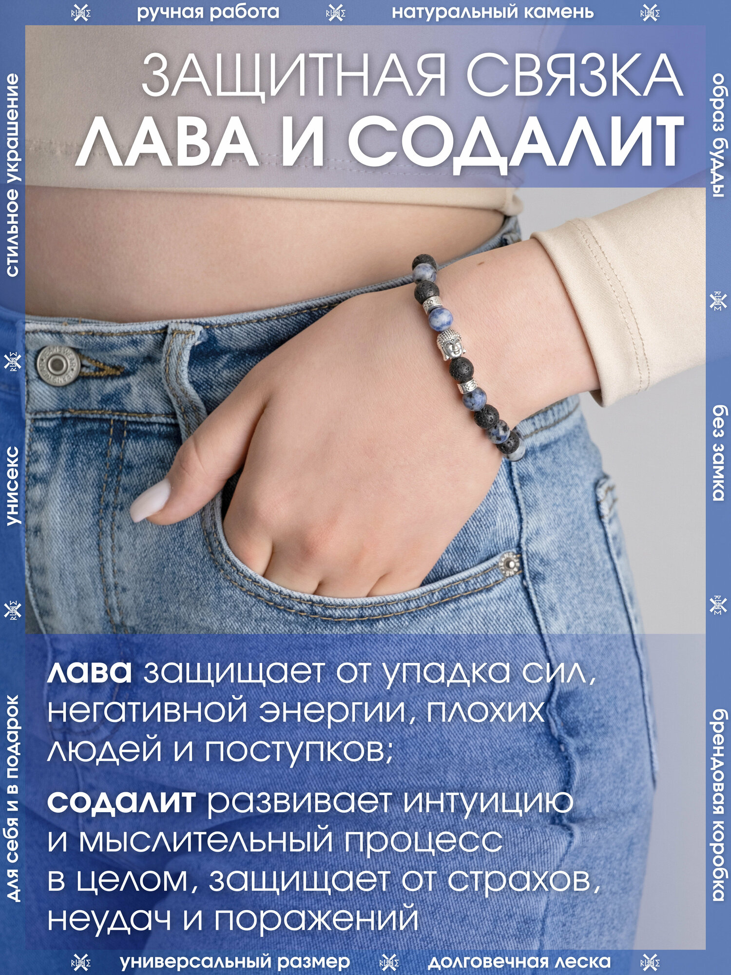 СохранитьЗащитный тибетский браслет Будда из натуральных камней Лава и Содалит/Охранный оберег-талисман из бусин на руку черный-синий/Бижутерия интересное: