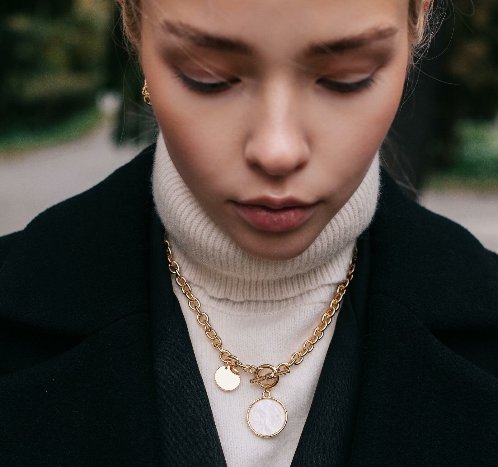 Купить Кулон "Цепь" перламутровый медальон, цвет бежевый в золоте, 42 см