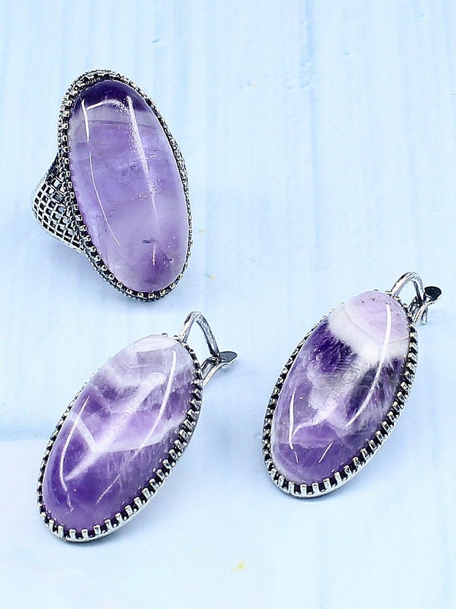 Комплект посеребренных украшений (серьги + кольцо) с натуральным аметистом 21