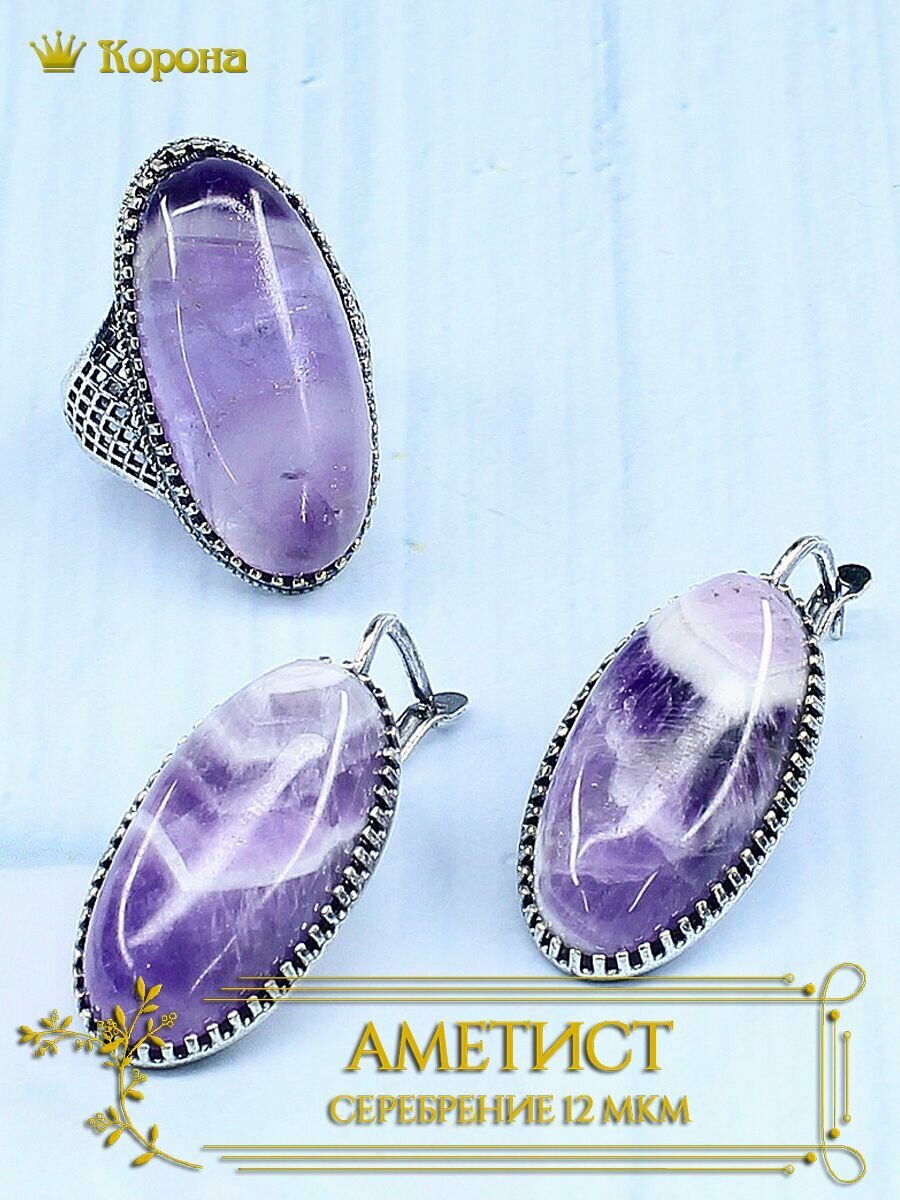 Комплект посеребренных украшений (серьги + кольцо) с натуральным аметистом 20,5