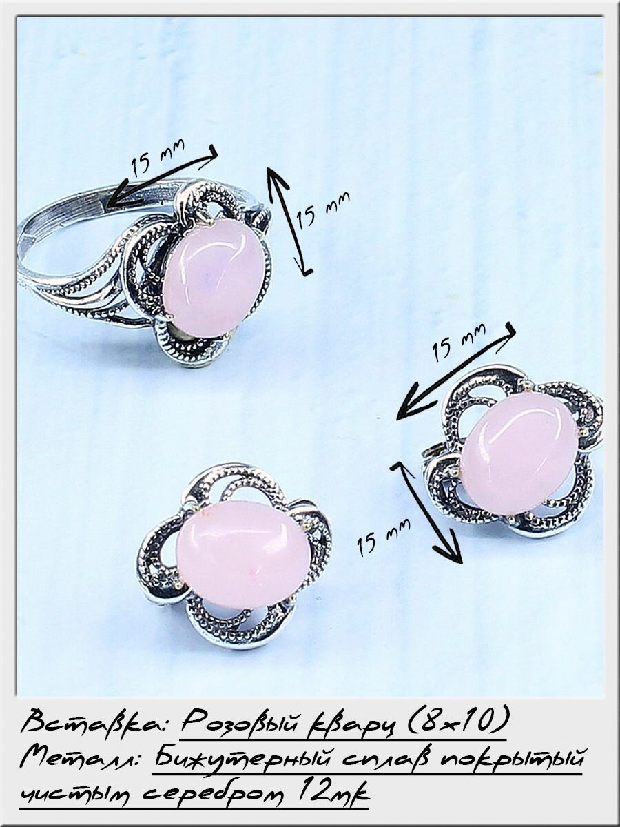 | Название модели | Комплект посеребренных украшений (серьги и кольцо) с кварцем розовым |