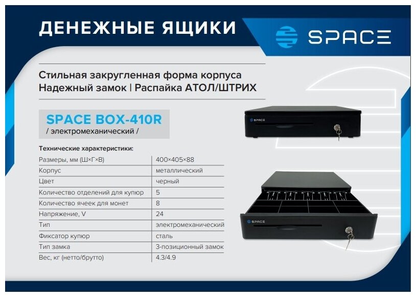 | Дополнительная информация | Отличает стильная закругленная форма корпуса и надежный замок. Тип ящика - электромеханический, т.е. замок открывается сигналом от кассы или POS-системы, что ускоряет процесс расчетов. Без подключения к торговому оборудованию открывается ключом |