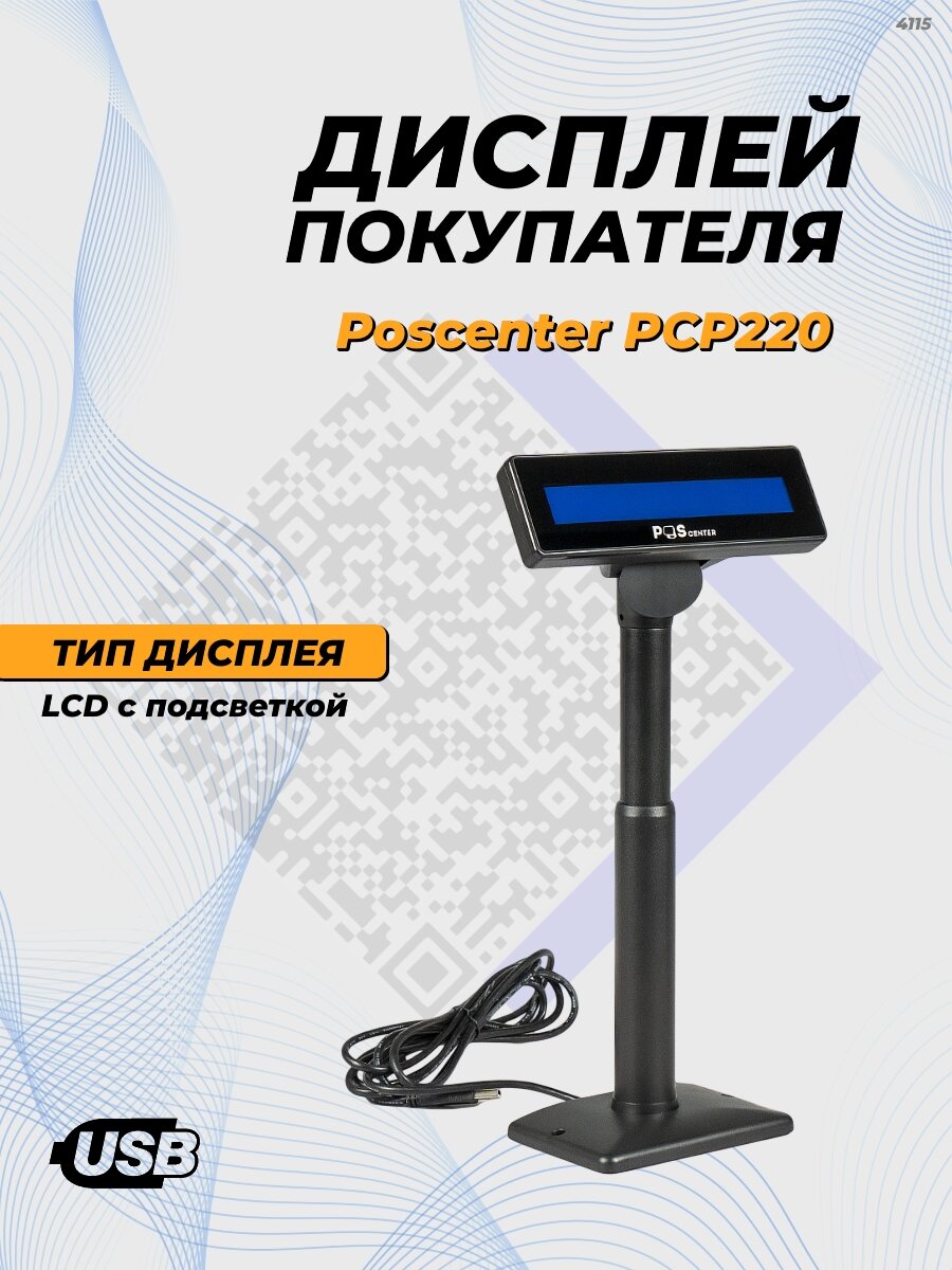 Дисплей покупателя POSCenter PCP220 (бело-голубой ЖКИ), подставка, USB кабель 3.0 м., черный