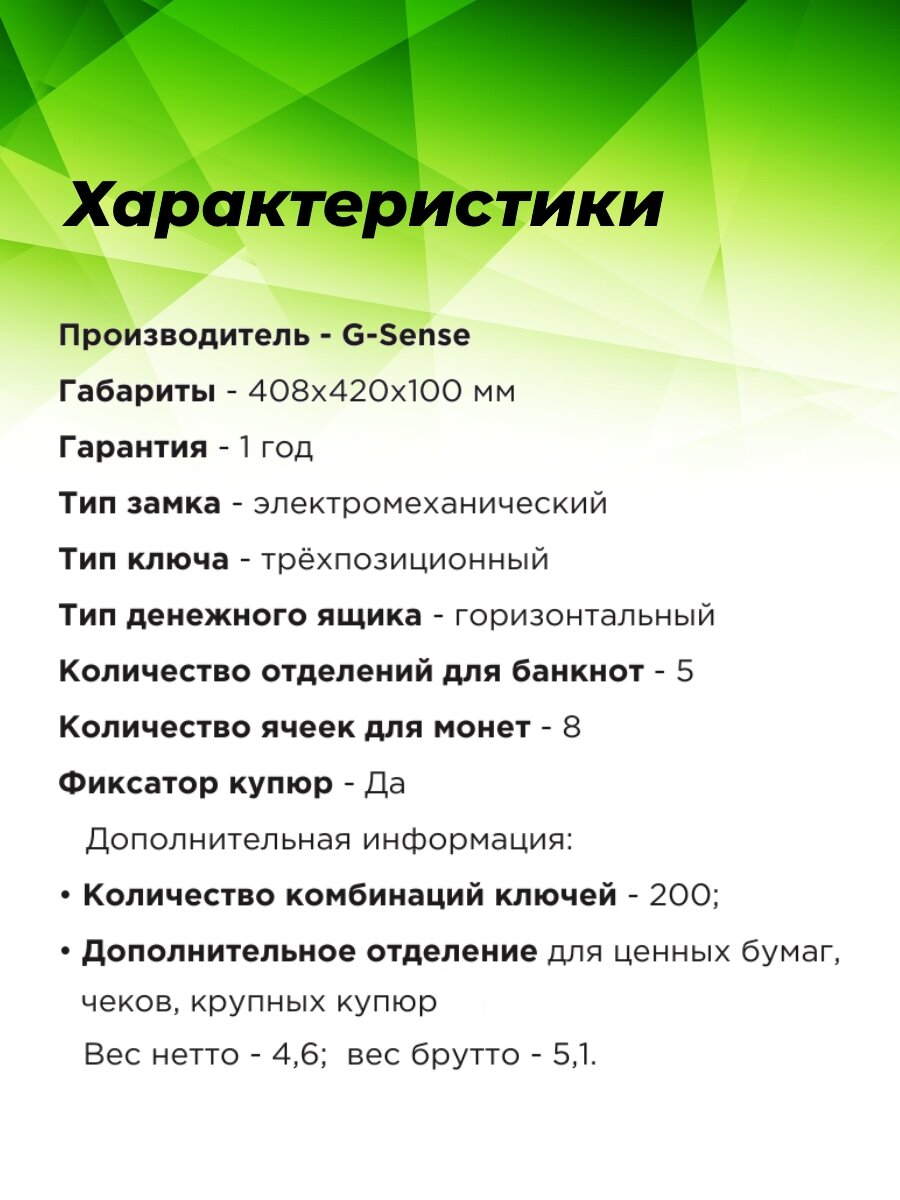 | Дополнительная информация | Количество комбинаций ключей: 200; Дополнительное отделение для ценных бумаг, чеков, крупных купюр и т.д. |