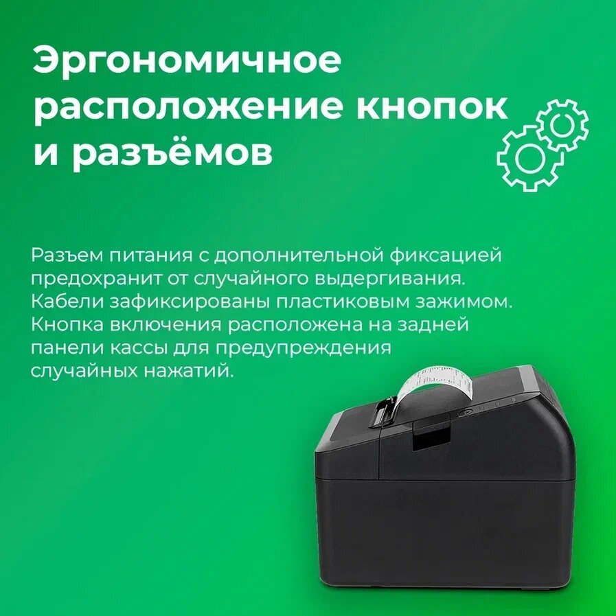 | Особенности | авторезка чека / встроенный принтер чеков / встроенный фискальный накопитель / подключение банковского терминала / подключение денежного ящика / подключение дисплея покупателя / подключение сканера штрих кода |