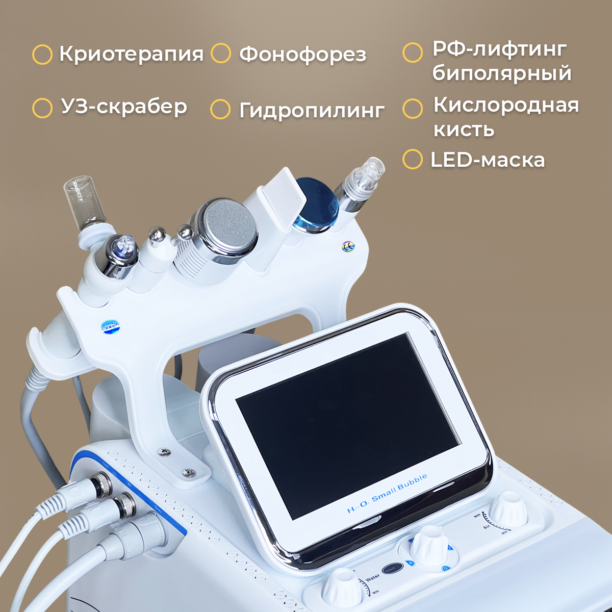 | Функции | RF-лифтинг / вакуумный массаж / вибромвакуумный массаж / газожидкостный пилинг / криотерапия / микродермабразия / спрей-процедуры / ультразвуковой пилинг / ультрафонофорез |