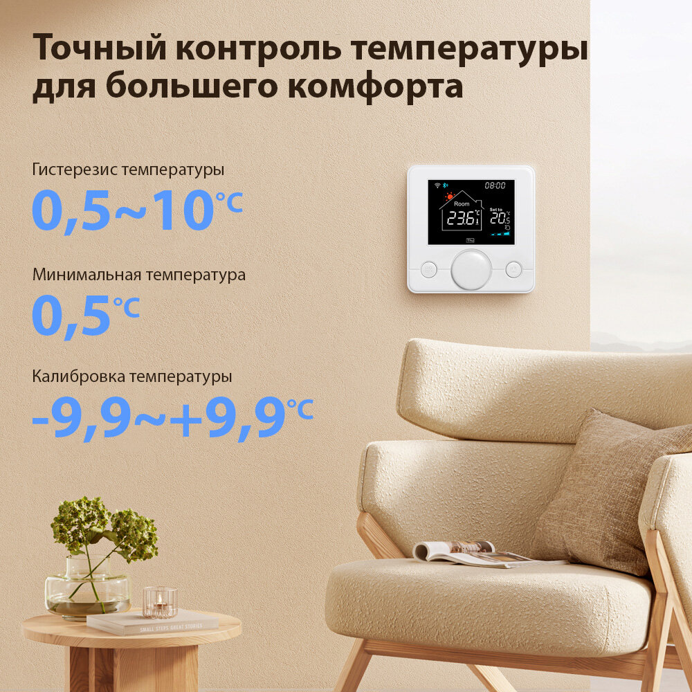 | Подробная комплектация | умный термостат, инструкция на английском языке, крепежные винты, блок управления, кабель питания USB Type-C. |