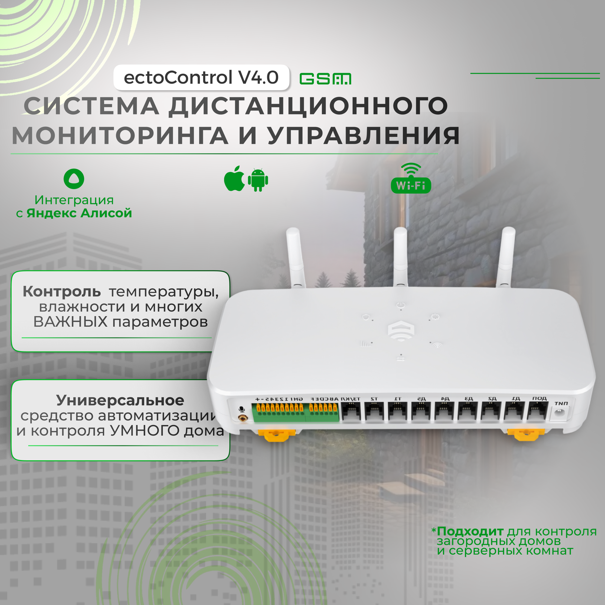 | Подробная комплектация | GSM/Wi-Fi система ectoControl v4.0 с функцией контроля сети 220В, адаптер питания 14В 2А, комплект антенн, полное руководство пользователя, гарантийный талон с печатью, аккумулятор 12В 1,2Ач, провод для АКБ, дополнительные предохранитель 250В F3A, упаковочная коробка |