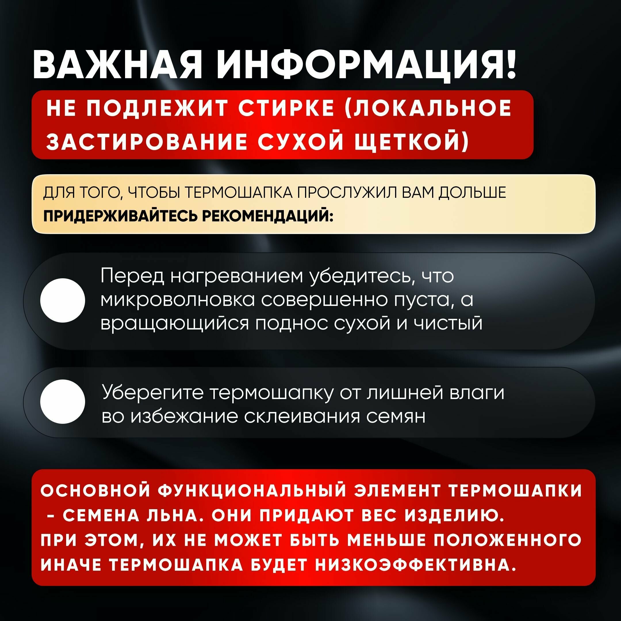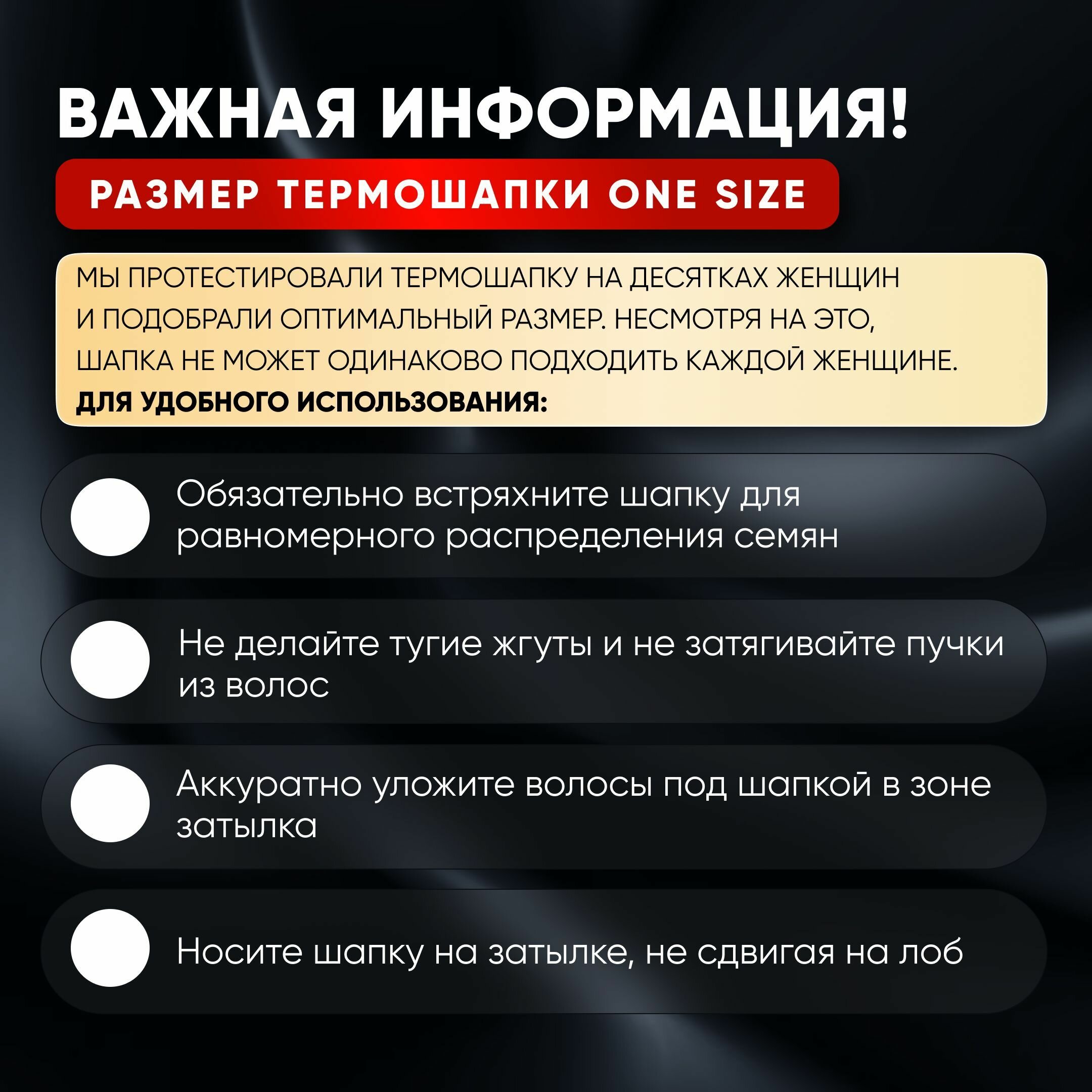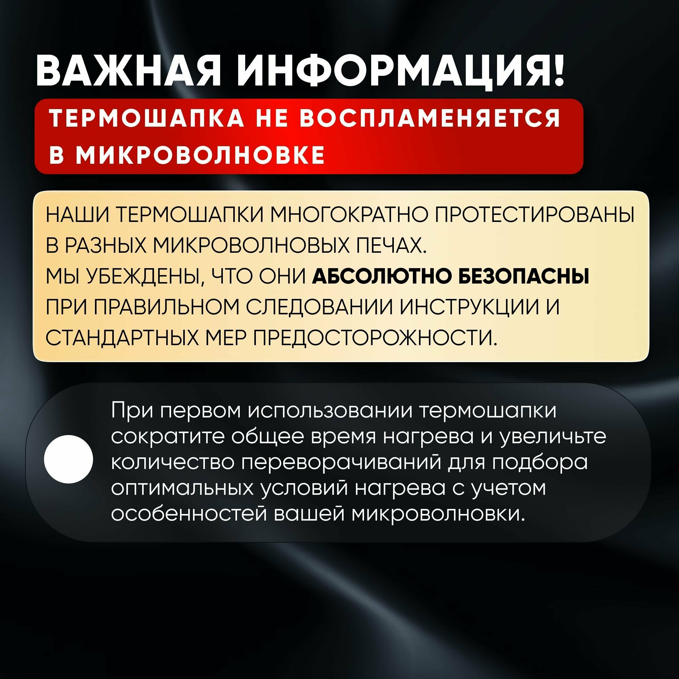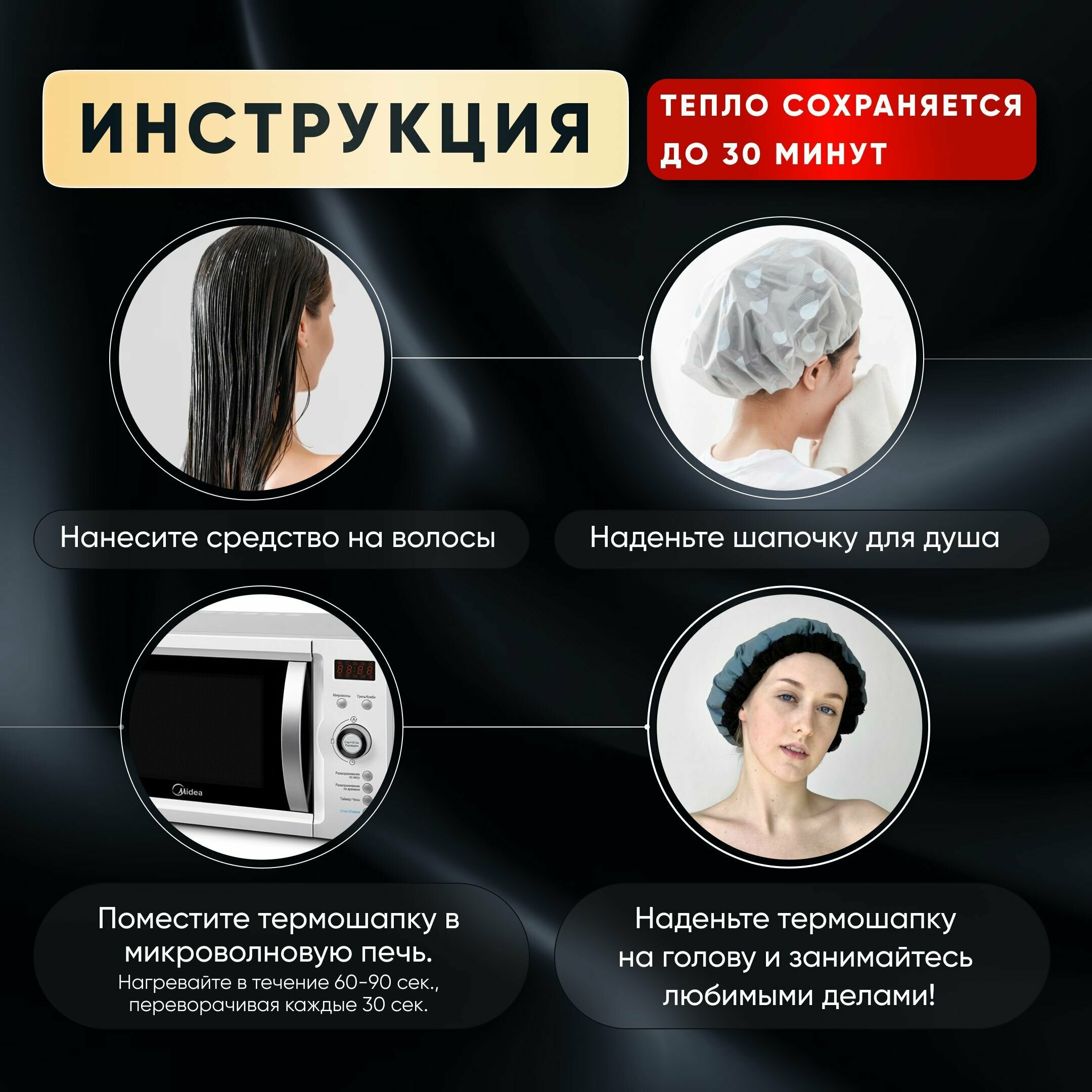 | Дополнительная информация | Если вы никогда не пробовали метод глубокого увлажнения волос с помощью терпошапки, то рекомендуем сделать это как можно скорей! Такая процедура легко заменит салонные процедуры по уходу за полотном волос. Вы сможете быстро восстановить волосы в домашних условиях! Нет никаких проводов, поэтому вам не придется сидеть около розетки и ждать окончания процедуры. Термошапку необходимо просто подогреть в микроволновой печи, надеть на голову и продолжить заниматься своими делами. |