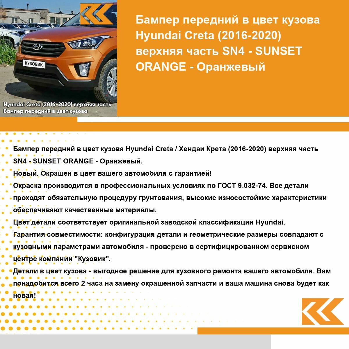 Ниже Вы можете прочитать отзывы на Бампер передний в цвет кузова для Хендай Крета Hyundai Creta (2016-2020) SN4 - SUNSET ORANGE - Оранжевый, ознакомится с подробными характеристиками, посмотреть интересные обзоры и фотографии на Бампер передний в цвет кузова для Хендай Крета Hyundai Creta (2016-2020) SN4 - SUNSET ORANGE - Оранжевый.