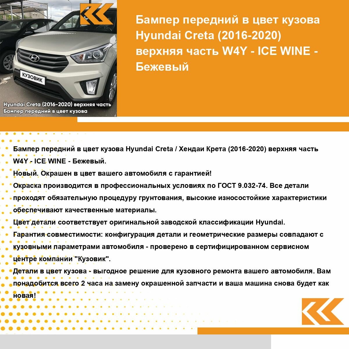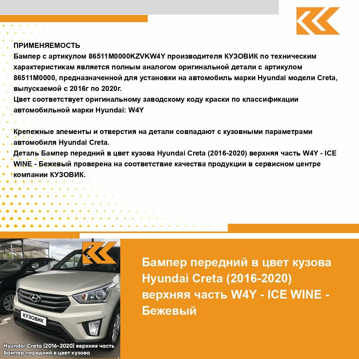 | Подробная комплектация | Бампер передний в цвет кузова Hyundai Creta верхняя часть |
