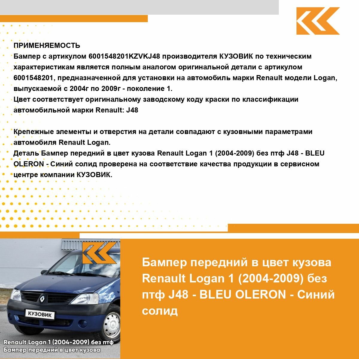 | Подробная комплектация | Бампер передний в цвет кузова Renault Logan 1 |