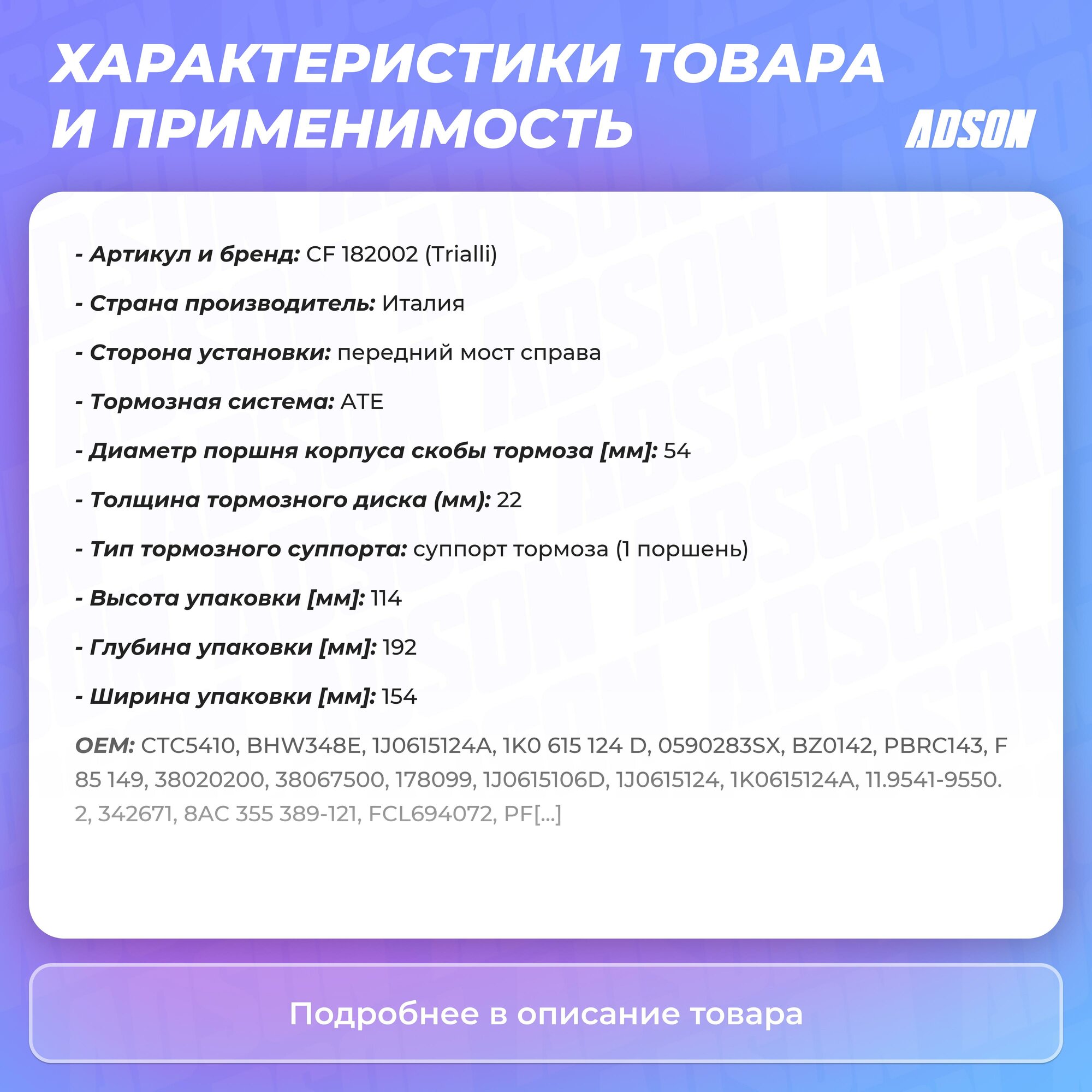 TRIALLI CF-182002 Суппорт торм. для а/м VW Polo Sedan (RUS) (10-) 1ZG перед. прав. d=54мм (CF 182002) интересное: