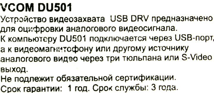 | Комплектация | Устройство видеозахвата DU501; Диск с ПО |