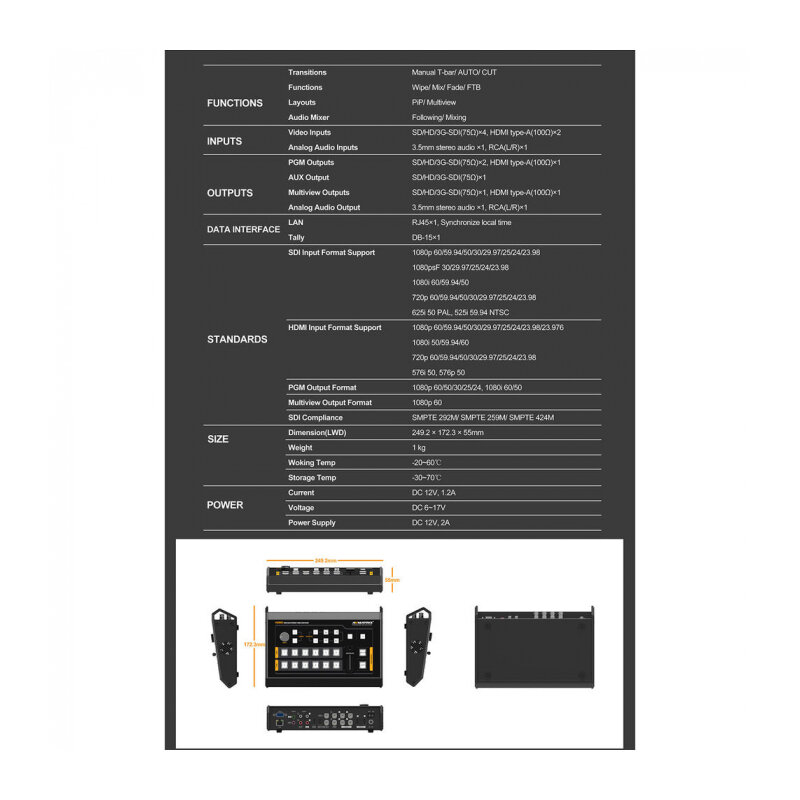 | Комплектация | Видеомикшер AVMATRIX VS0601 Блок питания (12V 2A) USB кабель (тип A-C) Руководство по эксплуатации и гарантийный талон |